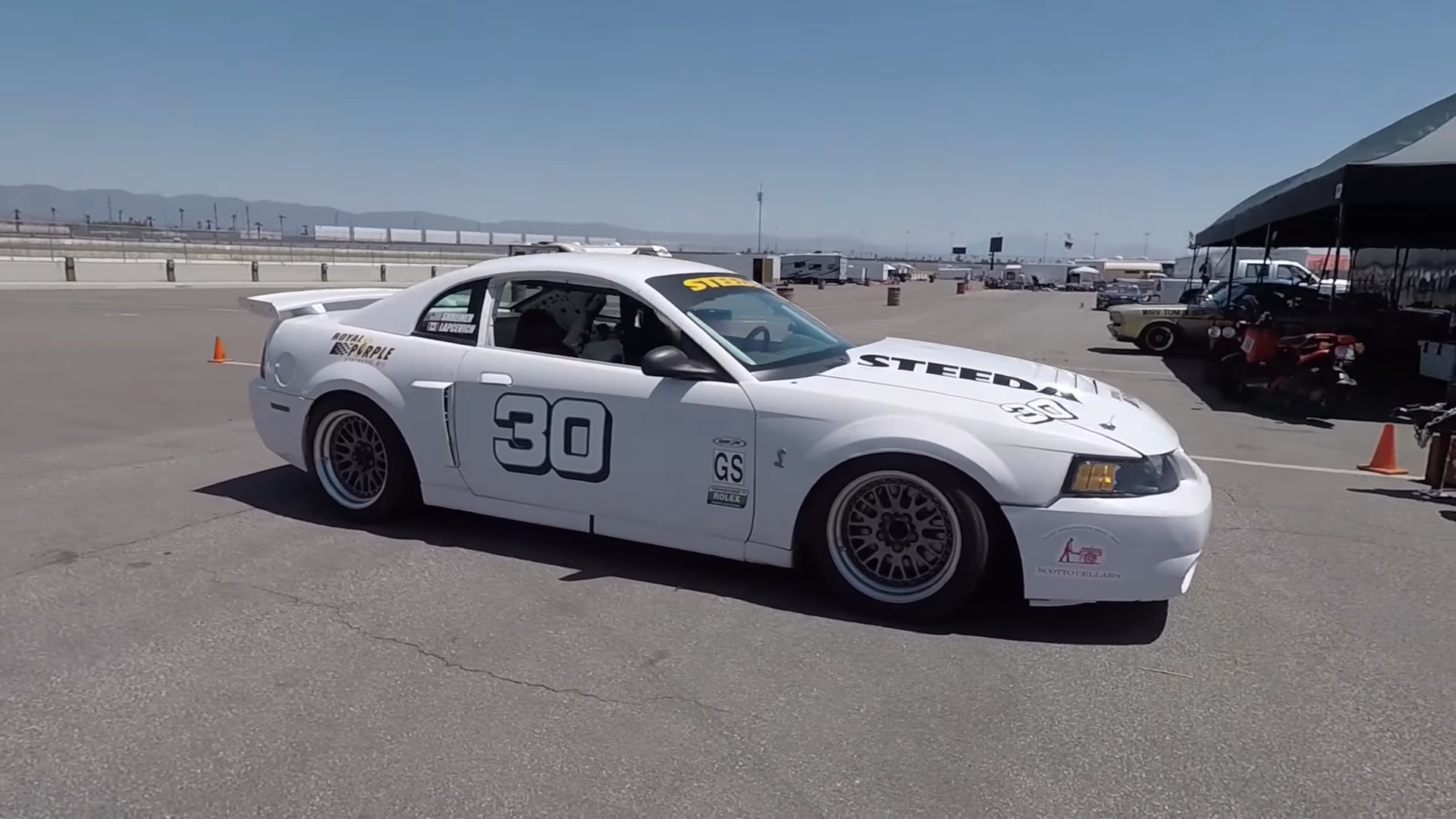 The subject in question is a 2002 Mustang Cobra, bought brand new by STEEDA and almost completely rebuilt for racing. To meet class regulations, the tuning company did away with the old supercharged 4.6L engine for a bigger, naturally-aspirated 5.0L V8 putting out 450 horses. After shaving off a couple hundred pounds of weight, fitting a custom 6-speed transmission, and adding some other track-ready goodies, STEEDA sold this car for $15,000 to its current owner – not a bad price compared to the Spec Mazda Miatas usually seen as one of the cheapest deals in organized racing.