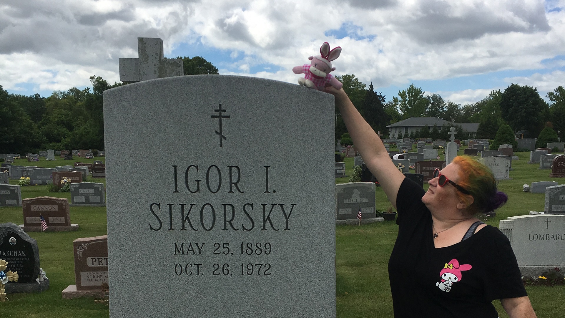 Unfortunately the museum was closed. We took photos of our monkey bunny mascot at the museum door, which was the closest we could get to the centaur. Because the museum was closed, this was good enough to earn us the points for this one. From there it was on to Stratford, and another aviator’s grave—Igor Sikorsky, the father of the helicopter. Once again, my wife put her Google and photo correlation skills to work, and we found it fairly easily.