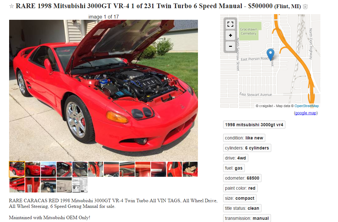 Spotted by Jalopnik on Craigslist is a 1998 Mitsubishi 3000GT VR-4 with an asking price of *drum roll please* $500,000. No, that’s not a typo.