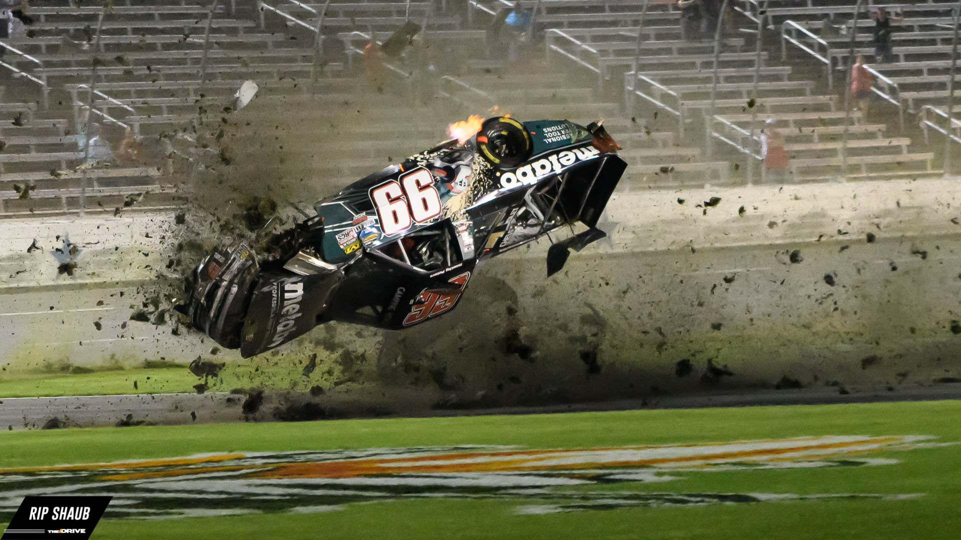 The recent rains at the track left the infield muddy, causing Peters’ truck to dig in instead of sliding across the infield. The truck flipped and spun before coming to a stop upside down. Peters slid across the finish line, netting him 166 laps of the 167 lap race.