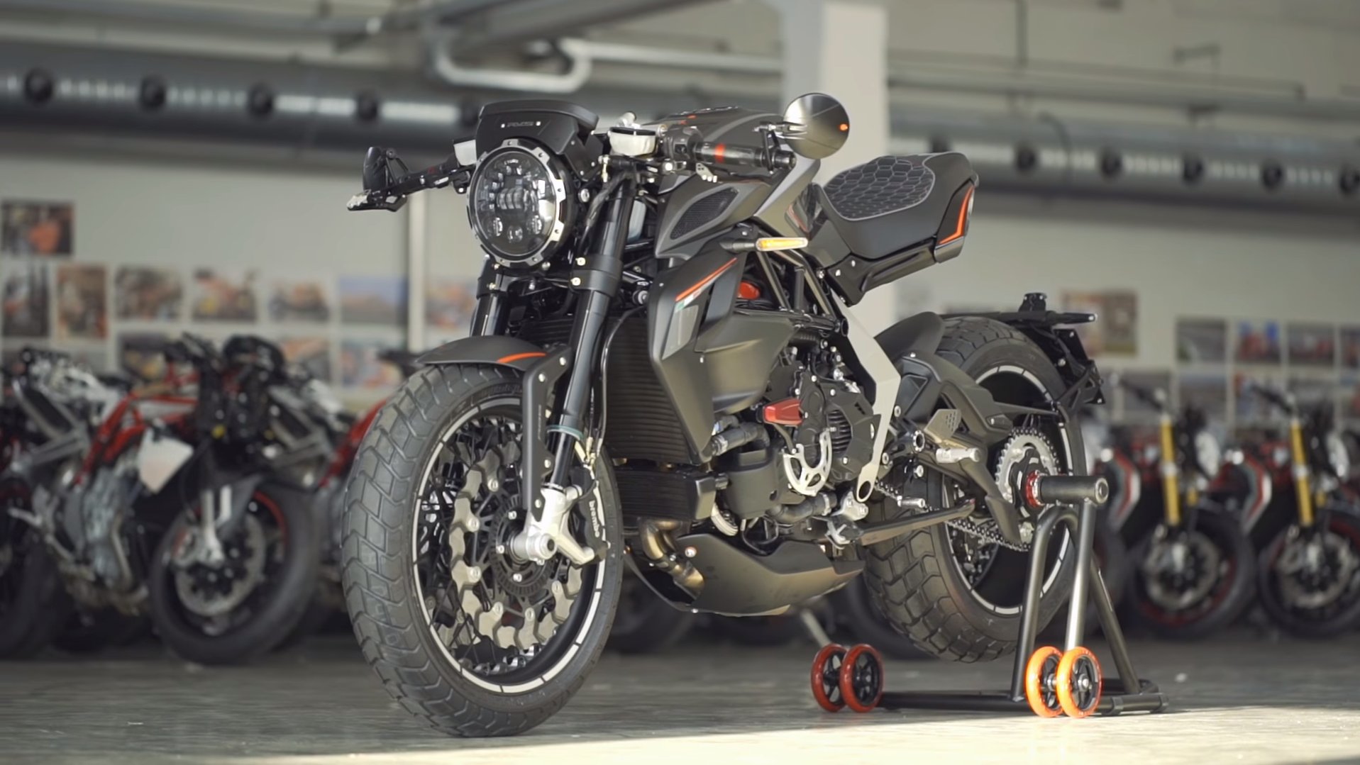 Based on the Dragster street fighter-style bike, the RVS packs an 800-cc inline three-cylinder engine making 150 horsepower at 12,800 rpm, according to Roadracing World. It has several updated components over the normal 800, like the chain tensioner, starter motor, camshafts, and valve guides. They’ve added lightness, too, which lets the bike weigh in around 350 pounds.