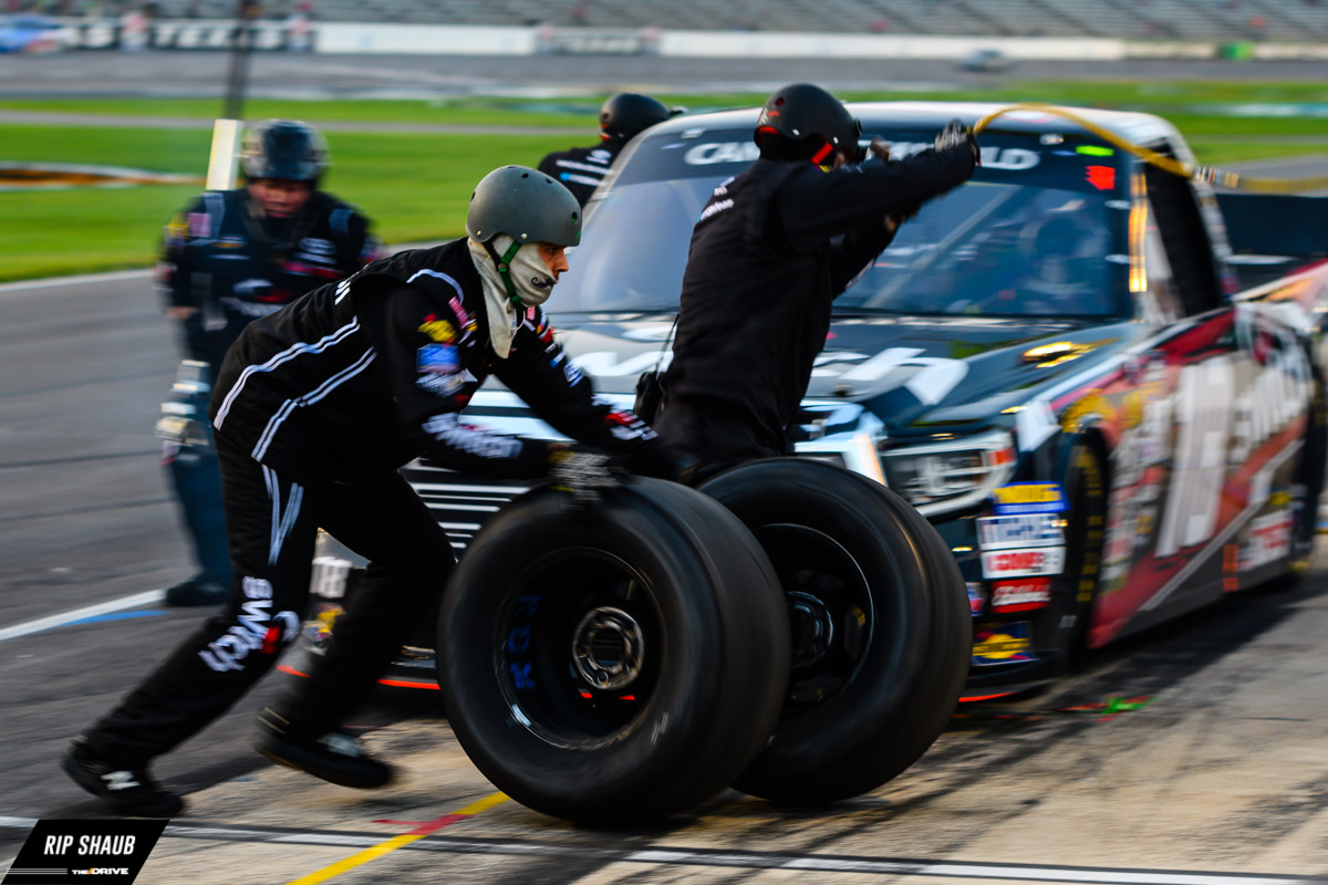 Gragson’s crew swaps tires during an early pit under caution. , © Rip Shaub – All Rights Reserved