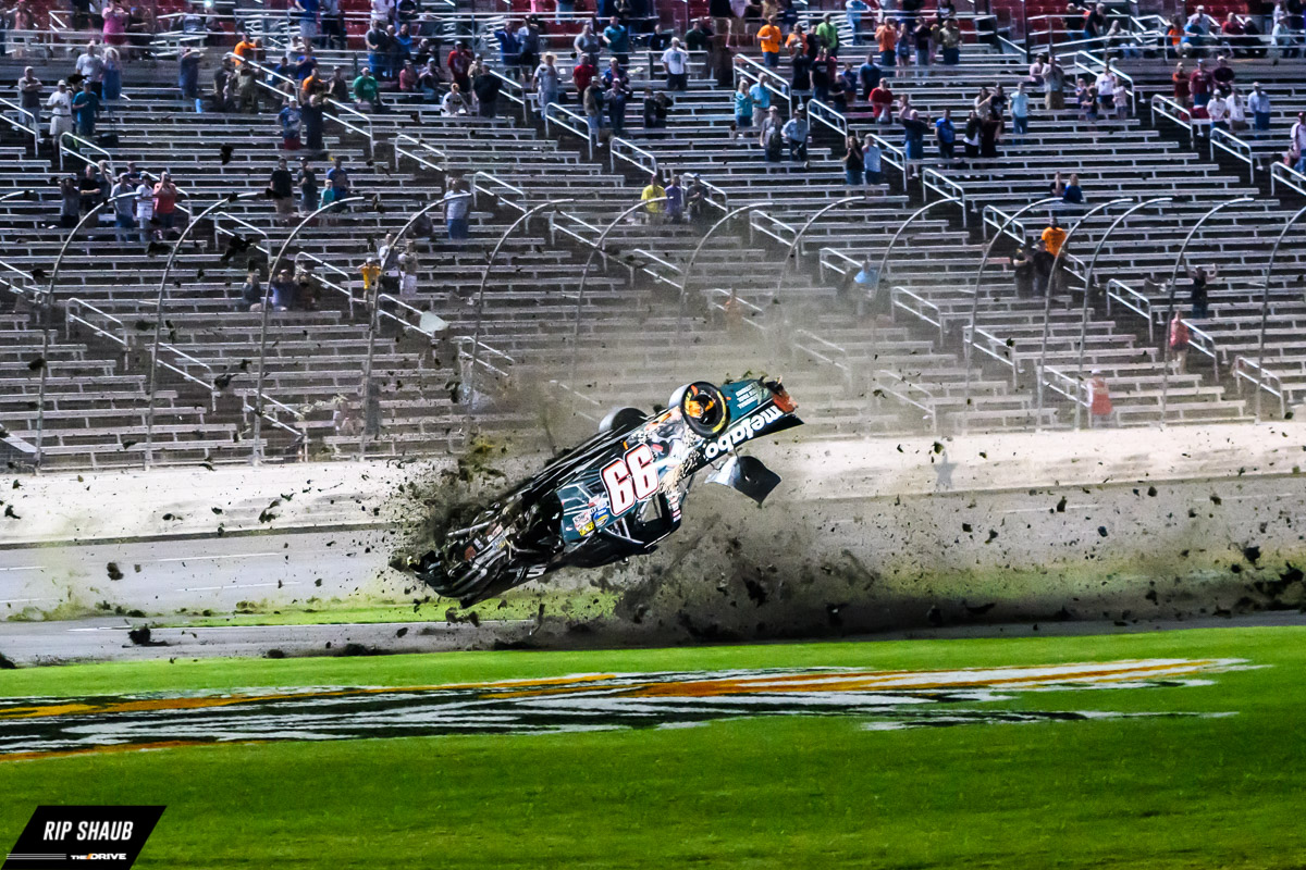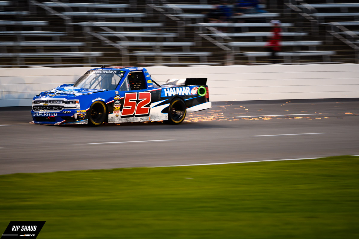 Stewart Friesen throws some sparks after an accident. His day would be over, 50 laps short of the finish., © Rip Shaub – All Rights Reserved