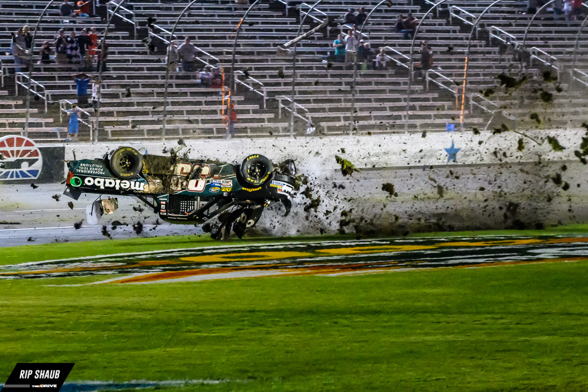 Timothy Peters has a harrowing crash on the second to the last lap of the winstaronlinegaming.com 400 at Texas Motor Speedway., © Rip Shaub – All Rights Reserved