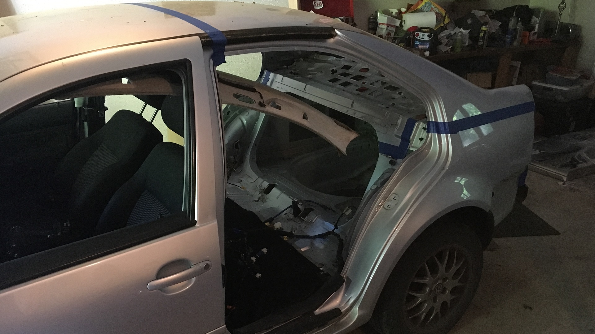 An additional step, which doesn’t apply to early Mk4 cars, was to remove the side curtain airbags that my later Mk4 has. These extend all the way through the passenger compartment from the A-pillar, across the roof, and down the C-pillar. You can see the problem with having these in place when half of the structure is about to get cut away. Even if you get some professional help with the kit, you will need to remove these airbags yourself, since it is typically illegal for a business to remove airbags. It is legal for you, as the owner, to remove them yourself. You can then use a VAG COM or similar computer to disable the airbag warning light on the dashboard, or remove the bags and plug in the inflators to fool it into thinking they are still there. Then, after removing the radio antenna from the roof, I was done stripping the car.