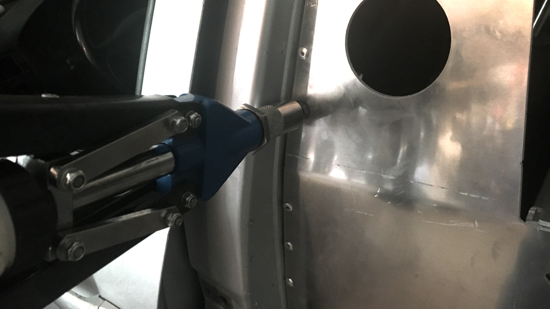 At this point my stepson came to the garage, bringing me a beer without me asking. Of course, it would be rude to refuse, so I was forced to accept and consume his gift. He asked what I was doing, so I showed him how I was drilling the holes as marked, putting in rivets, and then locking them into place using the tool my friend loaned me from his shop. He wanted to try it, so I let him squeeze the riveter a few times. He quickly got the hang of it, and the next thing I knew he was drilling and riveting the rest of the brace into position by himself while I sat back, drank beer, and supervised. I’ve never aspired to have children of my own, but I’m beginning to see the benefits of having them around for free labor, not to mention beer delivery.