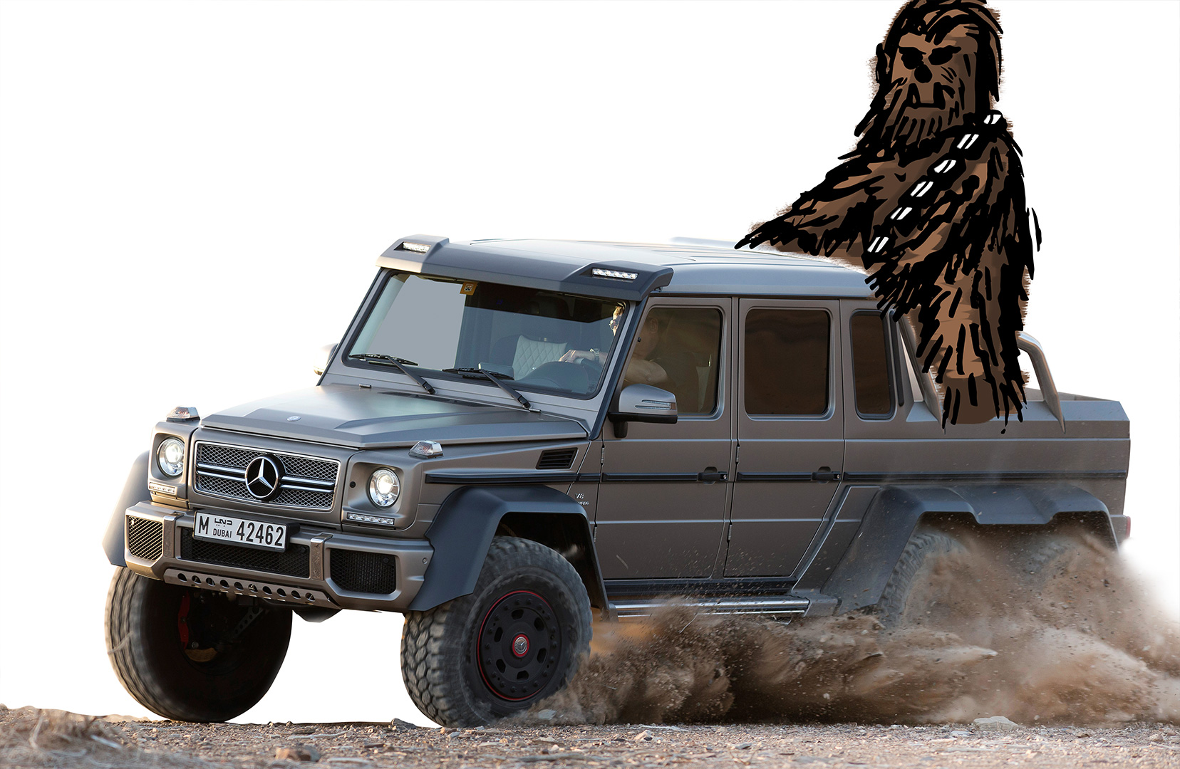 Chewbacca has a history of using impractical-yet-badass equipment—witness his choice of a bowcaster over a blaster. No other vehicle in the galaxy represents Chewie’s personal blend of size, strength, and silliness than the six-wheel-drive G63. Plus, that V8’s growl would sound right at home on Kashyyyk.