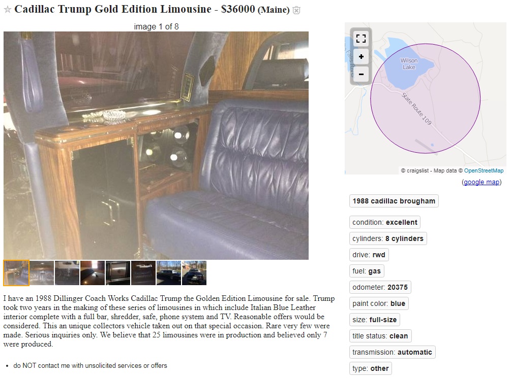 We’ve heard all about Donald Trump’s many business ventures—Trump Airlines, Trump Vodka, Trump Steaks, Trump University—but in addition to those and long before his Presidential aspirations, Trump also worked with Cadillac to produce a line of limousines with his name on them–the Trump Executive Series and Trump Golden Series. Now, you can own one of your own.