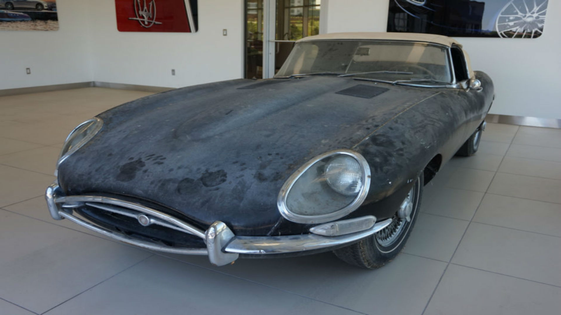 The car in question is a 1965 Series-1 Jaguar XKE Roadster, posted Tuesday on Bring a Trailer with 75,542 miles on the clock. This manual E-Type definitely needs some TLC as it’s a non-running project car with a dead brake system and cracked turn signals. The good news is that the completely original 4.2-liter engine works and the project is “largely complete” according to the seller; it’s also currently priced at only $60,000. The car’s current “paint scheme” is black, but it was originally bought with Jag’s signature Opalescent green with a white interior. Before it was rescued by BaT, this E-Type sat in storage for 20 years on its owner’s property in Nevada, so the good wash and detail is definitely needed to fully appreciate it.