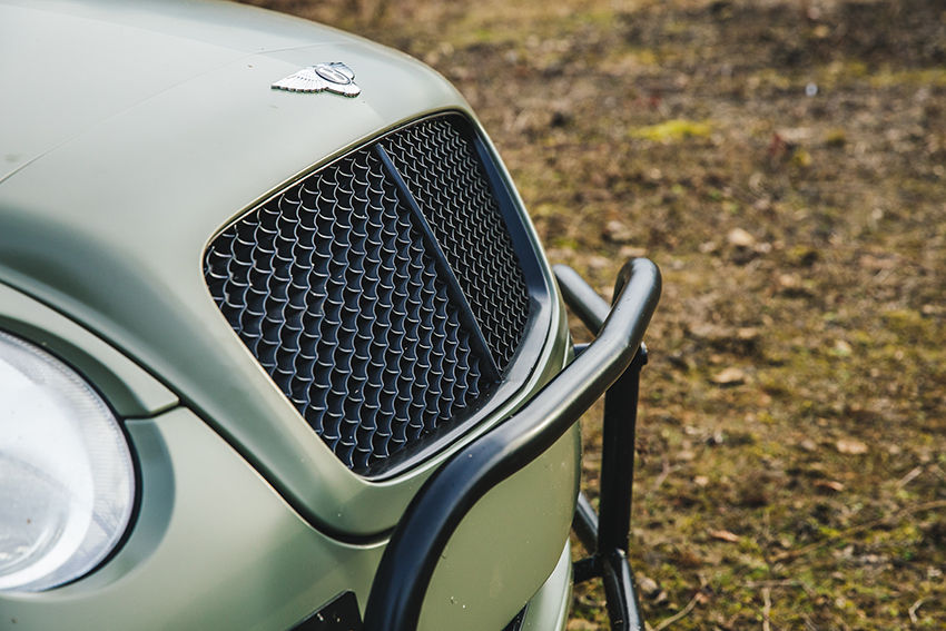 In terms of the Bentley’s modifications, the car most noticeably is wrapped in a Khaki Green Avery Dennison Wrap, but underneath the original color is Silver Metallic paint. For performance, the car is equipped with eight Quantum Racing single adjustable shocks (two shocks per corner), 17-inch custom steel wheels wrapped in 265/65/17 INSA Turbo tires, an external steel roll cage which has been painted black, Lazer Lamps Triple-R24 LED Racing Light, custom lower arms, custom wife arches, Comp-Brake custom front brakes, Bash Plates under-body protection, and a spare wheel and gas cans mounted on the rear of the Bentley.
