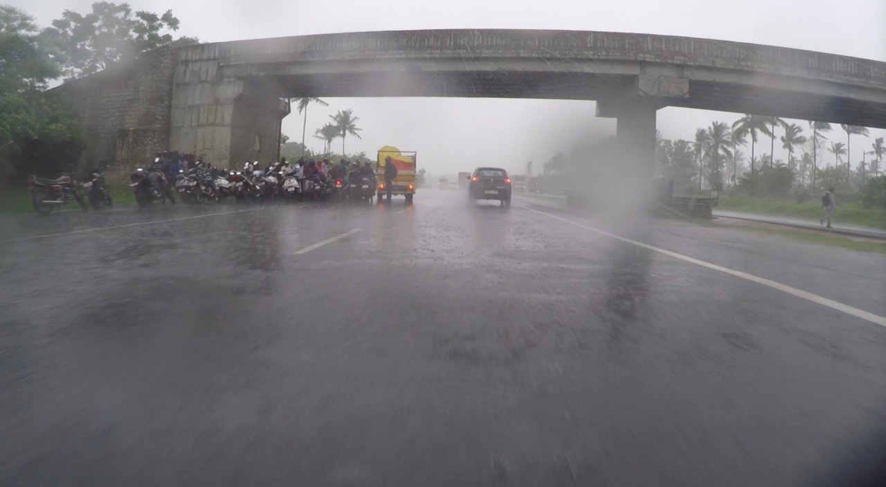 This is a two-lane highway. And that is a mass of bicycles, motorcycles and a trike parked in the passing lane under a bridge. Why? Because the riders have dismounted to shield themselves from the rain. This isn’t unusual. This is just the best image I could pull from the GoPro mounted on our front bumper, which was lucky to survive the trip. Two others mounted there didn’t, both victims of road debris.