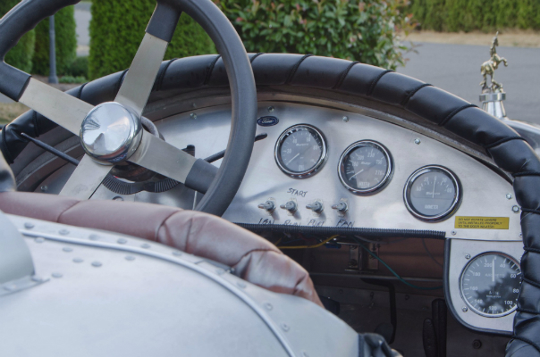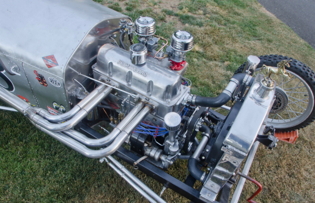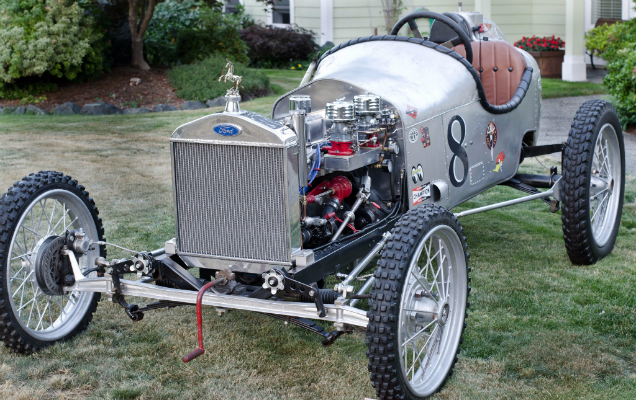 The engine, originally 189 cubic inches, was bumped up to 200 cubic inches with a modified crankshaft from a Ford Model A, and the head is a Chevrolet overhead valve design. The camshaft, too, is a modified Model A part, and the oil pump is from Volkswagen. The flywheel is a native Model T part, but like everything else, it has been modified and lightened. The seller estimates that the engine produces around 150 horsepower.