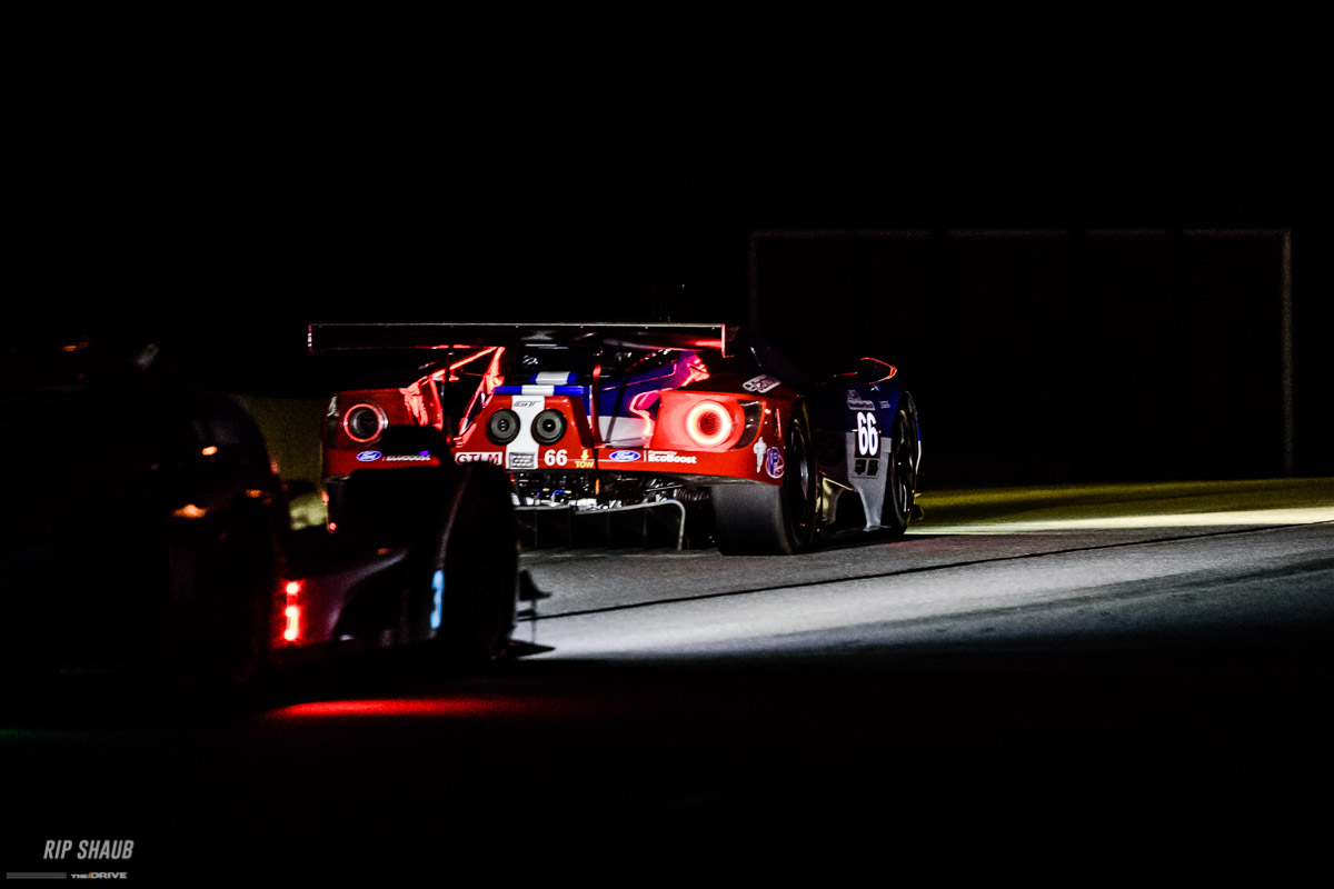 Night practice gives time to acclimate to the track in the dark. The white headlights of a prototype illuminate the #66 Ford GT., © Rip Shaub – All Rights Reserved