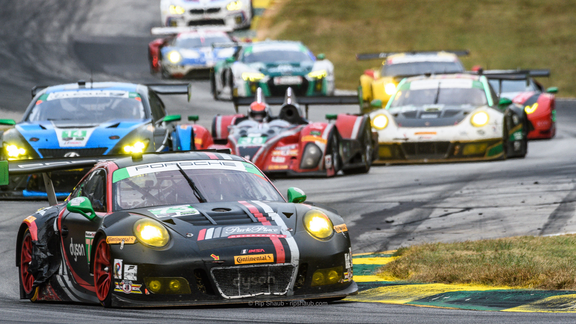 5:30 p.m. Standing at the top of Turn 5, just at the bottom of Spectator Hill, gives a head-on view into the Esses as the cars climb back up the hill. Park Place Motorsports’ 911 GT3 R leads the way., © Rip Shaub – All Rights Reserved