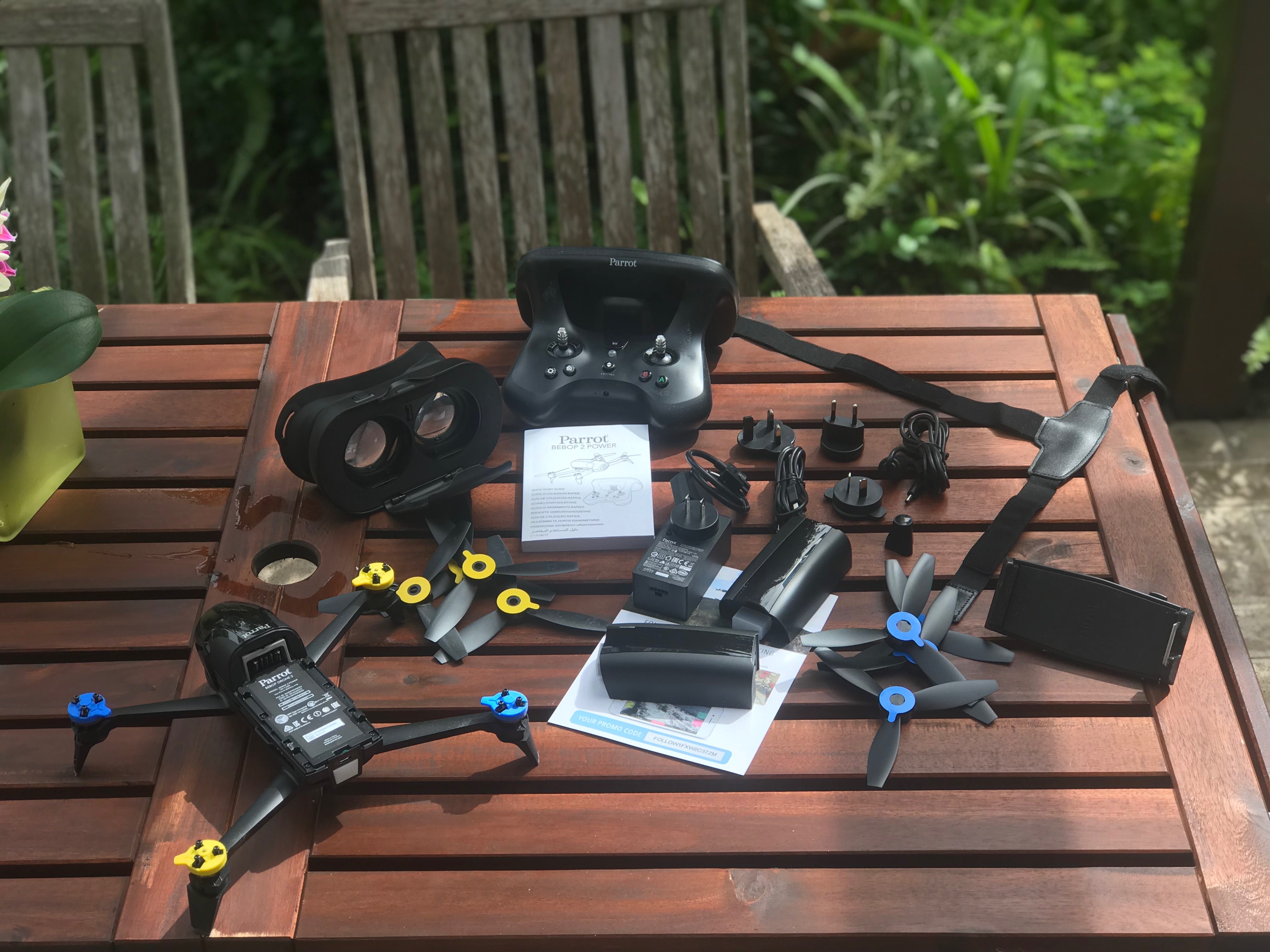 Included in the package is the following: the drone, the new Skycontroller 2, a smartphone/table stand that attaches to said controller, 4 additional propellers, the ‘Cockpitglasses 2’ (FPV goggles), 2 batteries (each providing for 30-minute flight time on a full charge), and the required chargers and cables. Here’s what that looks like: