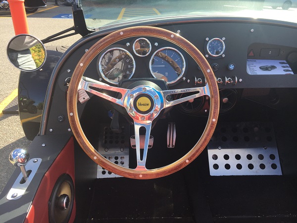 The modern/retro theme extends to the cockpit of the Venice, which I can’t really call the interior because it’s exposed to the elements. A thin wooden steering wheel harkens back to the vintage racers that inspired it. It does not include an airbag since it is legally considered a motorcycle with less than four wheels (seat belts are included). The gauges and controls look retro, but the heater actually works, as do the heated seats. At my height, the top edge of the windshield was right in the middle of my line of vision, distorting my view of the road slightly unless I tilted my head above or below it. The windshield is not adjustable but next year Vanderhall plans to add a tilt function to the seats to help drivers avoid this problem.