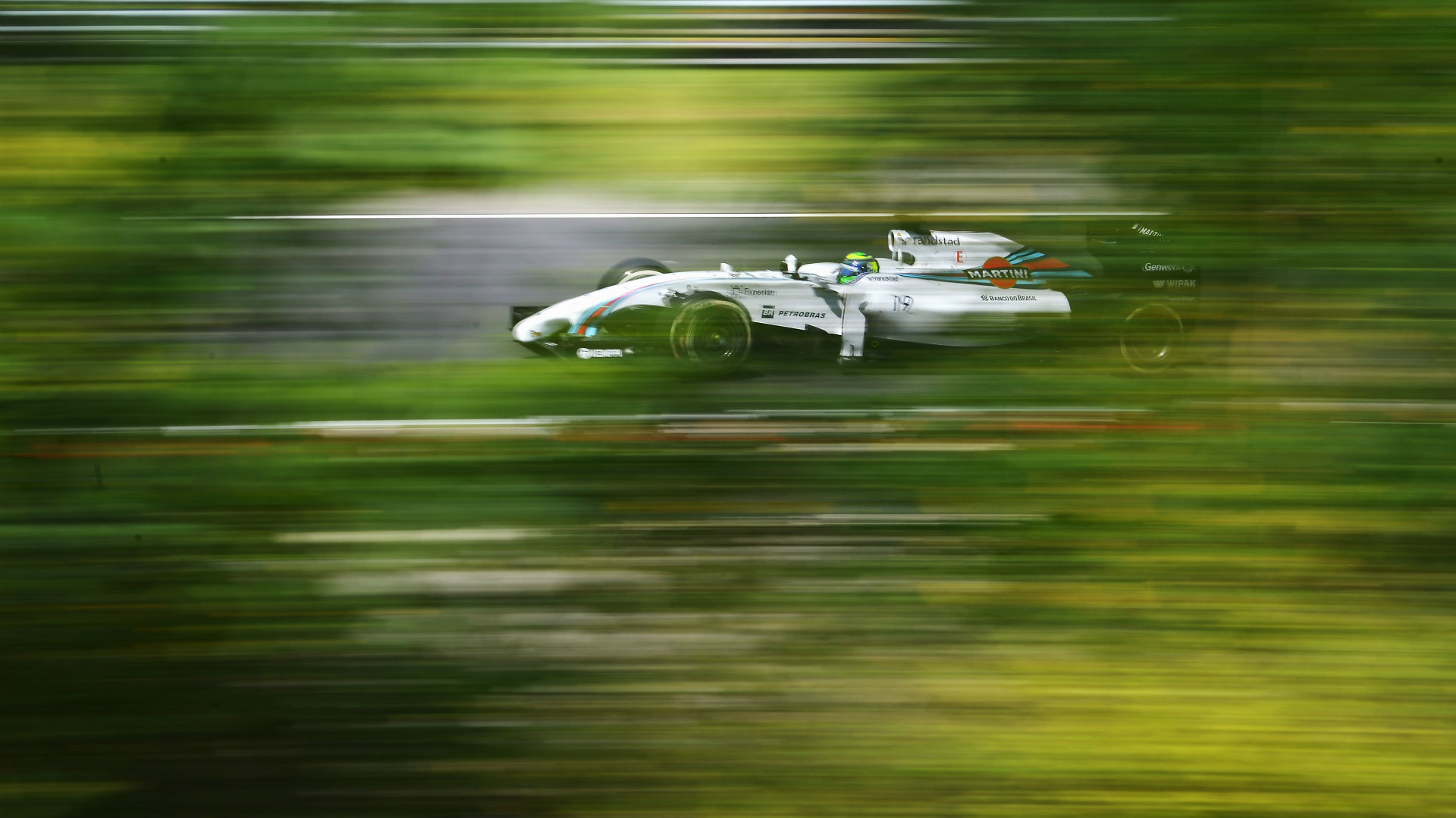 The FW36 first passes by the tree in the foreground at 0:07, and later, at 1:33, putting Kubica’s lap time approximately in the 1:26 window. As a frame of reference, Felipe Massa’s Q3 time at the 2014 Hungarian Grand Prix was in the low 1:24 area.