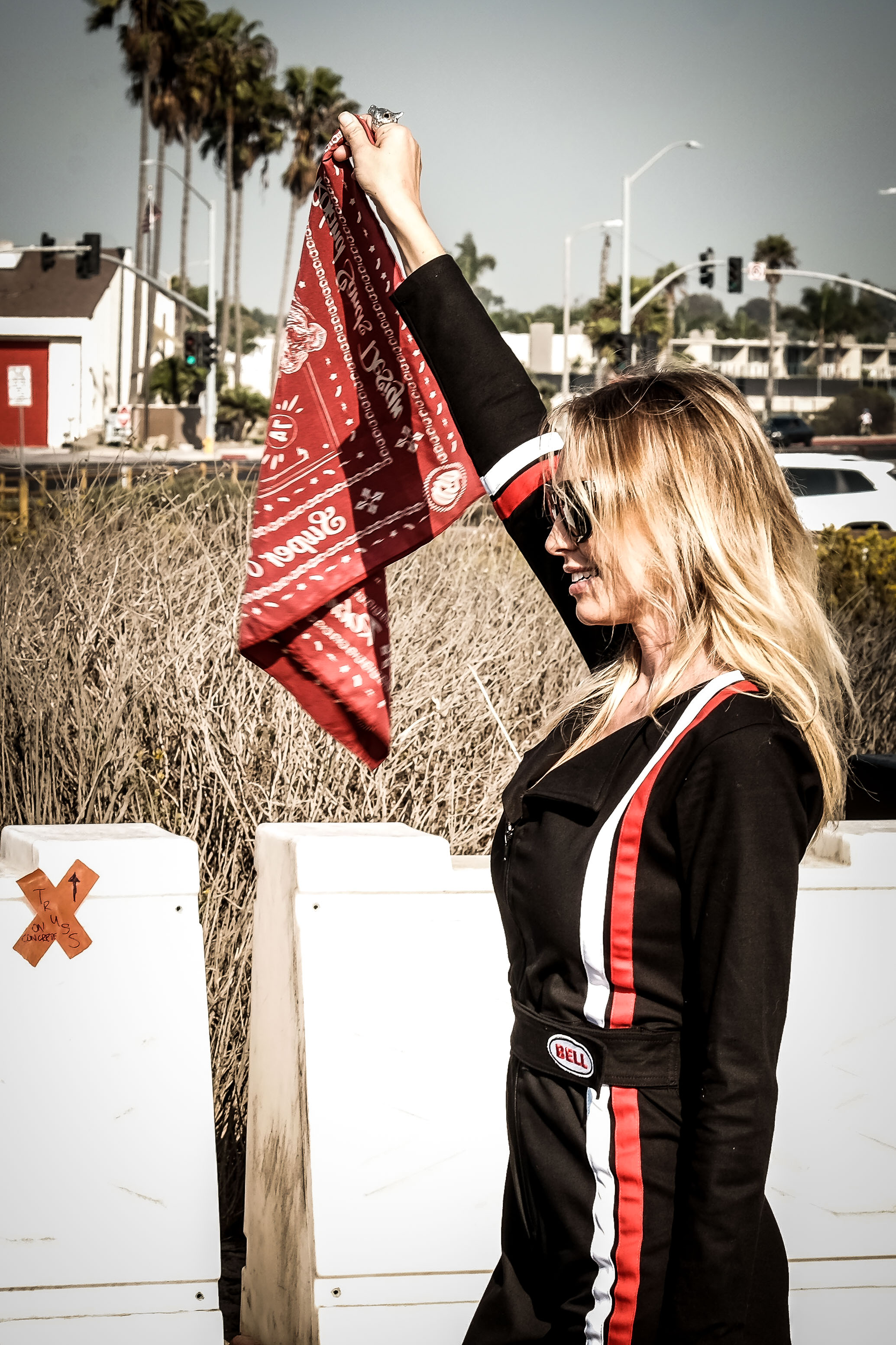 , Leticia Cline—motorcyclist, flat track racer, and badass—plays flag girl for the day by cueing the racers in the BMW Salty Sprint Drag Race. , Sam BendallThe day began at 8 a.m. with a surf competition. By 11 a.m., the roar of flat track and mini-moto racing practice sessions had washed out the crashing of the waves, music echoed from the Salty Sea Legs concert venue, and the bike path bustled with event-goers eager to catch a glimpse of the action. By the afternoon and evening hours, the festival was in full swing, with bands playing, a Super Hooligan Flat Track Competition, and the BMW Salty Sprint Drag Race.