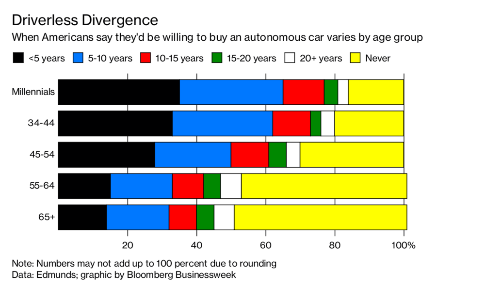 According to a new study by Edmunds, the short answer is “yes.” Bloomberg shows a breakdown of how badly each age group wants a self-driving car. Not surprisingly, the younger the demographic, the more those drivers are willing to embrace the new technology.