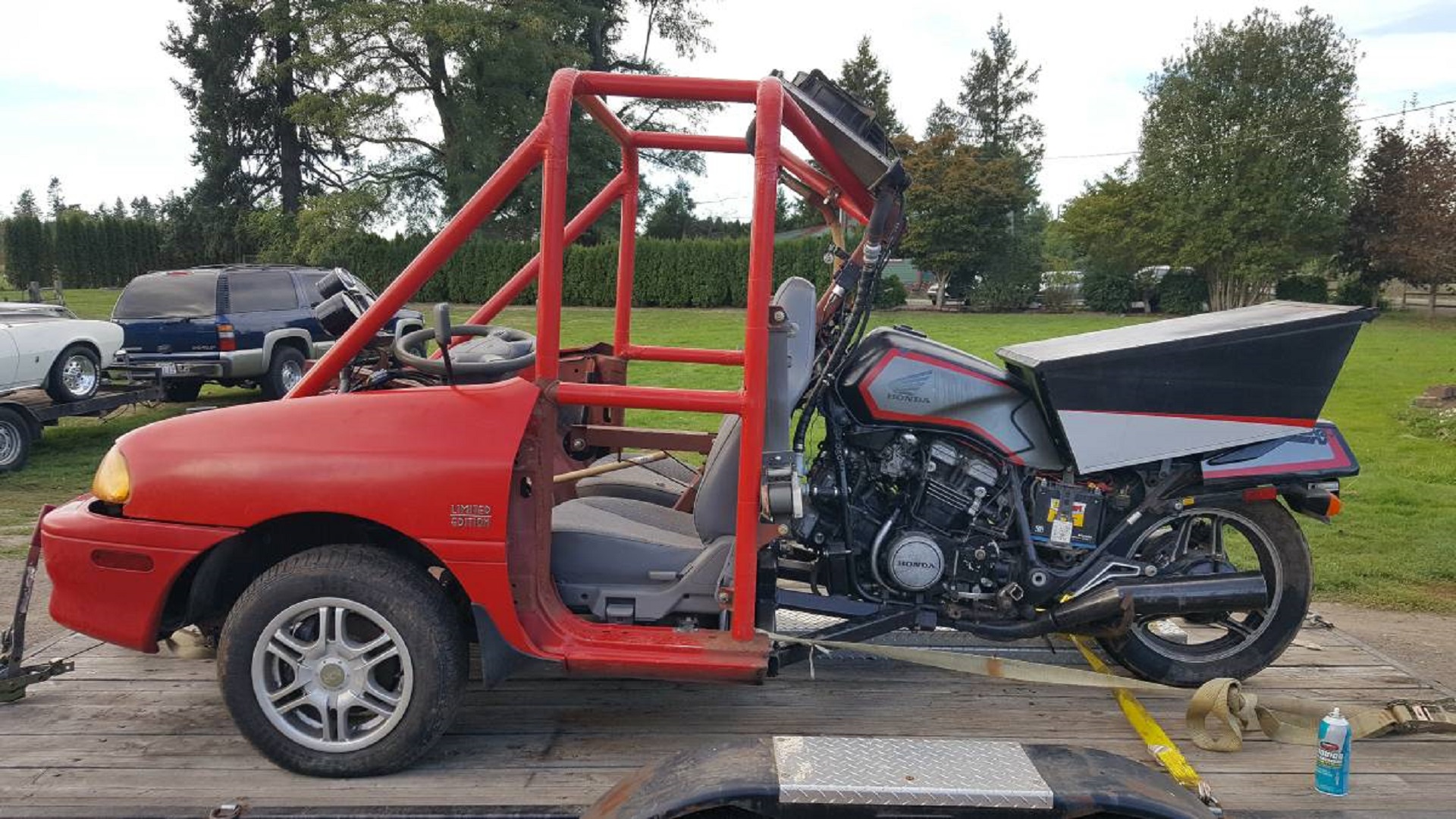 Spotted on Craigslist with an exceptionally reasonable asking price of $850 is a 1985 Honda VF1100 motorcycle (also known as the V65 Sabre) with the front end of a Ford Aspire. With the motorbike portion providing drive from the rear and the Ford section dedicated to steering, this Japanese-American Siamese creation can be likened to a Can-Am Spyder trike with even more curb appeal.