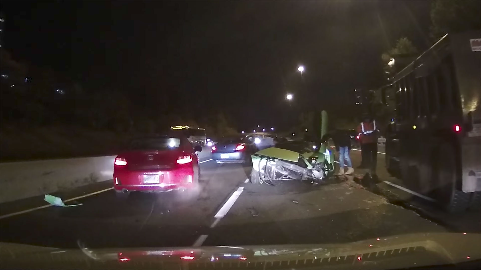 Ten minutes and less than 5 miles later, the same Lambo is seen stationary, facing the wrong way round, and significantly smashed up, leaning against a dump truck with two other cars pulled over close by. Both panels that wear the V12 supercar’s front and rear license plates are strewn across the road at an angle that perfectly puts this guy’s reg in plain view of the camera, somewhat karmically, for the world to see.