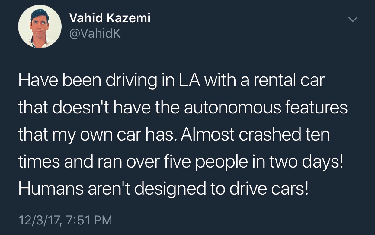 Kazemi, accustomed to what he describes as the “autonomous” features of his own car, rents one without them. As a result, he confesses that he “almost crashed ten times and ran over five people in two days.” He then concludes that “humans aren’t designed to drive cars!”