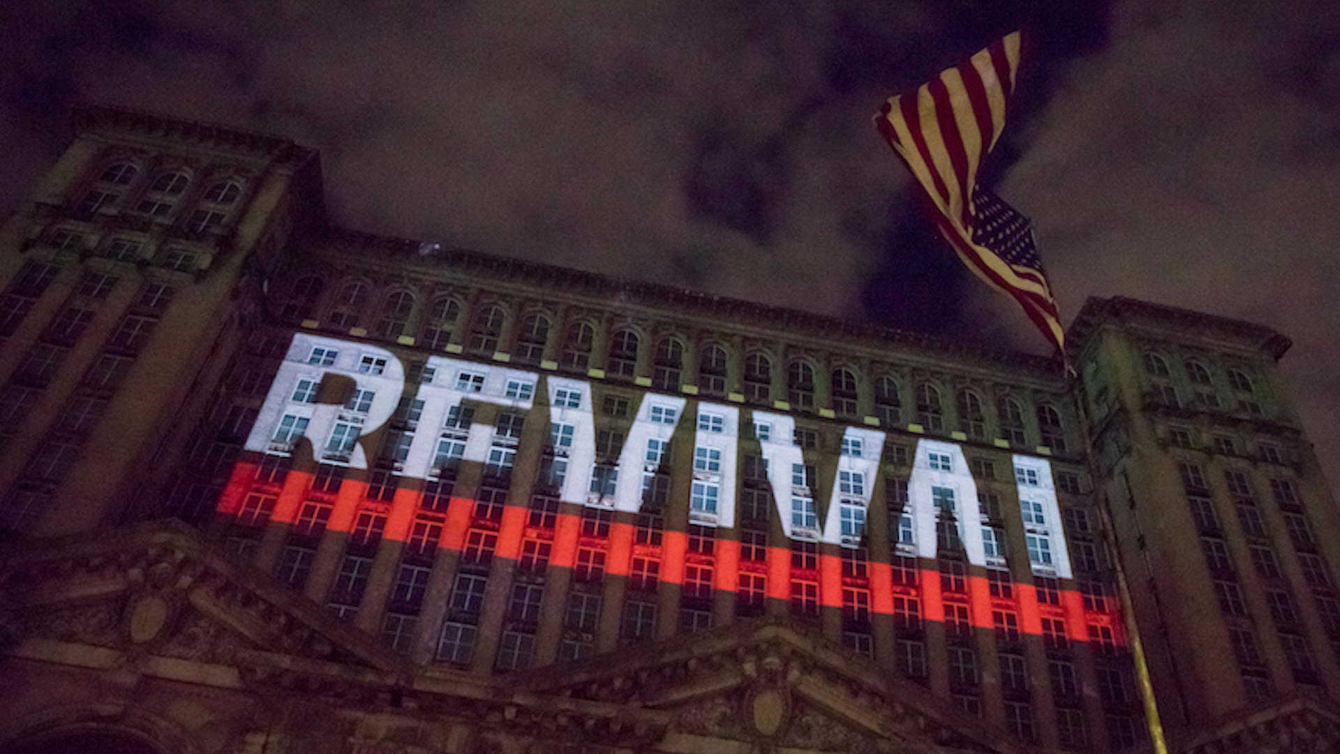 Eminem revealed the cover art of his highly-anticipated new album, REVIVAL, by projecting it against Detroit’s famous and vacant Michigan Central Station in Corktown last night.
