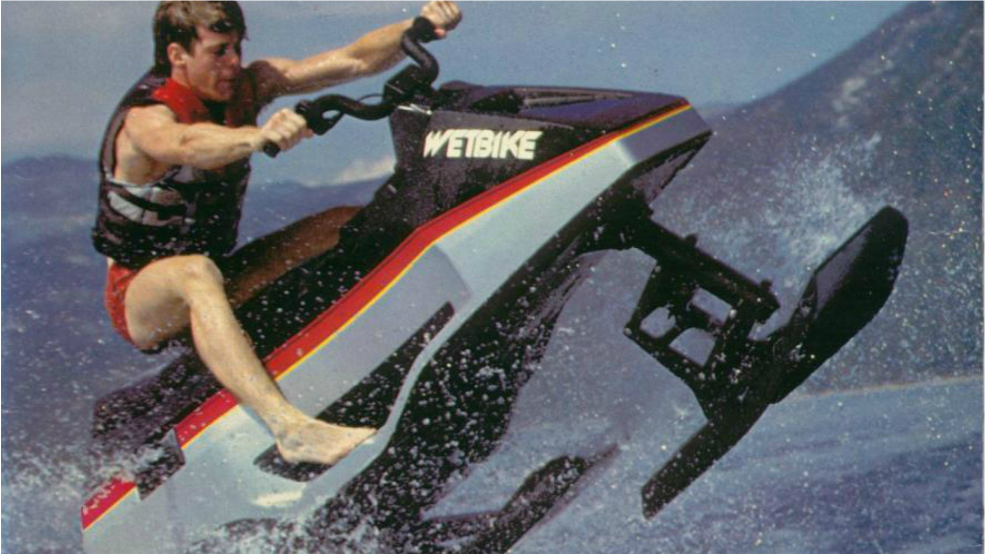 , Vintage Wetbike Brochure (cropped), Wetbike.netThe Wetbike remained in production only until 1992. Reviewers noted that it was harder to ride than regular PWCs and prone to tipping if you didn’t maintain balance. It also needed deeper water to launch than most peers; the draft was a substantial 2.5 feet until it got up on the plane.