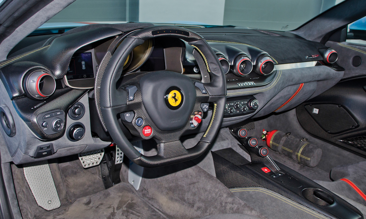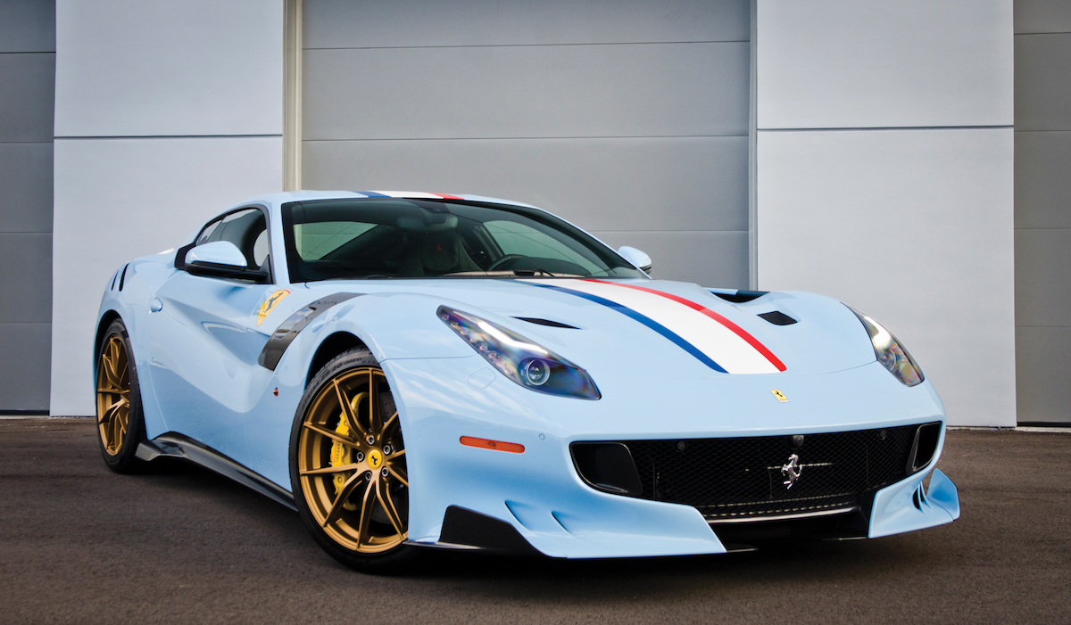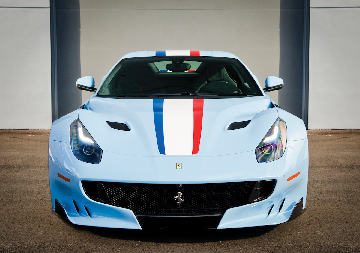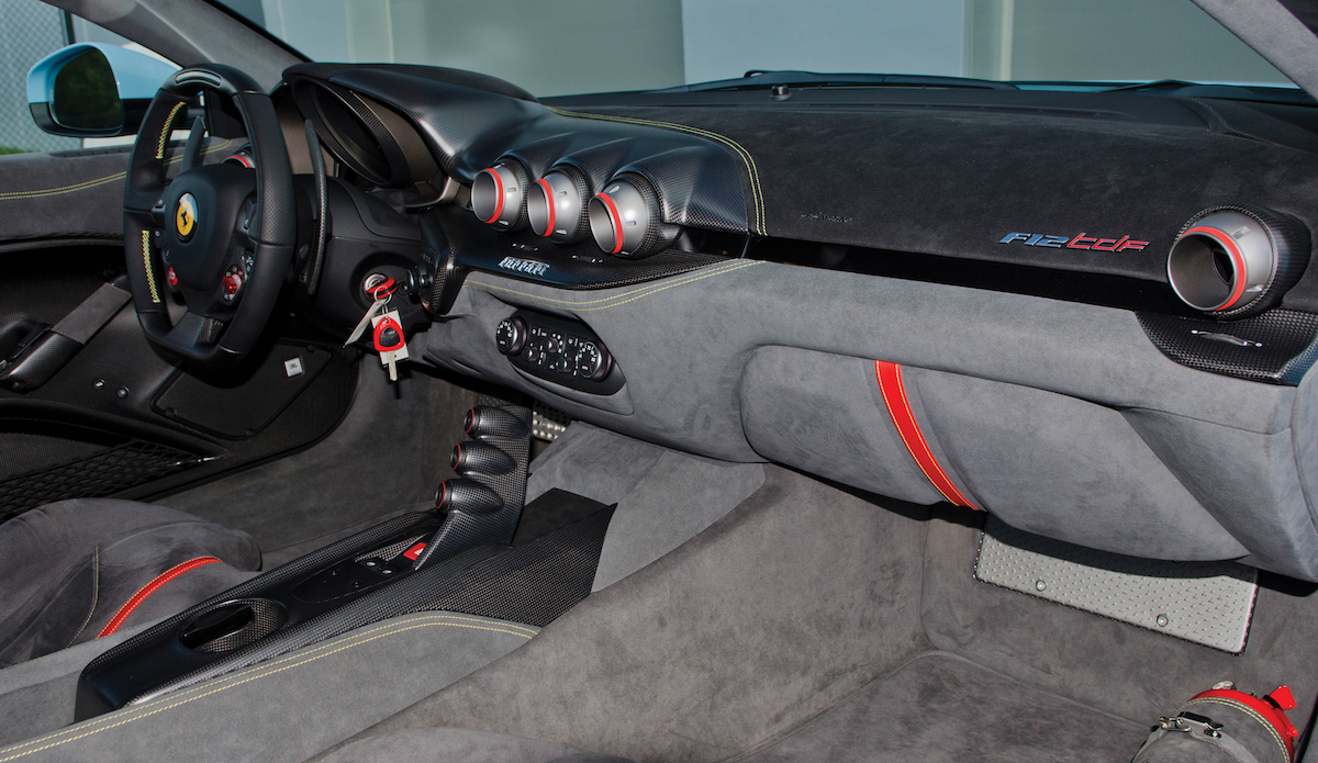 The car’s only owner went through Ferrari’s bespoke Atelier/Tailor Made configurator programs, so this F12tdf wears a unique Azzurro La Plata livery with a French tricolor stripe on the hood (Blu, Bianco, and Rosso). This is the same livery used on the Ferrari 250 GT Berlinetta that won the Tour de France Automobile in 1956.
