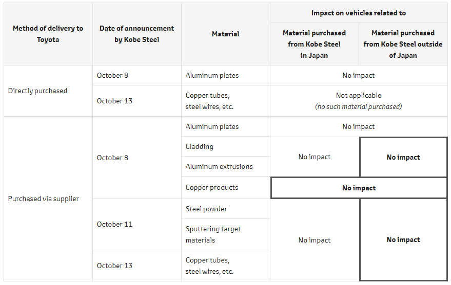 , Bold borders indicate newest findings, via ToyotaIn the above tables, Toyota was able to determine that vehicles sold under both the Toyota and Lexus brands were not impacted by the findings at Kobe Steel. The manufacturer indicated that the affected materials were not used in any of its vehicles sold in Japan or elsewhere in the world. Though the manufacturer did believe this was the case in November 2017, it was finally able to publish data indicating the this was indeed the case, relinquishing the concerns that sub-par materials may have been used to assembly Toyota’s vehicles, according to the manufacturer’s internal standards.