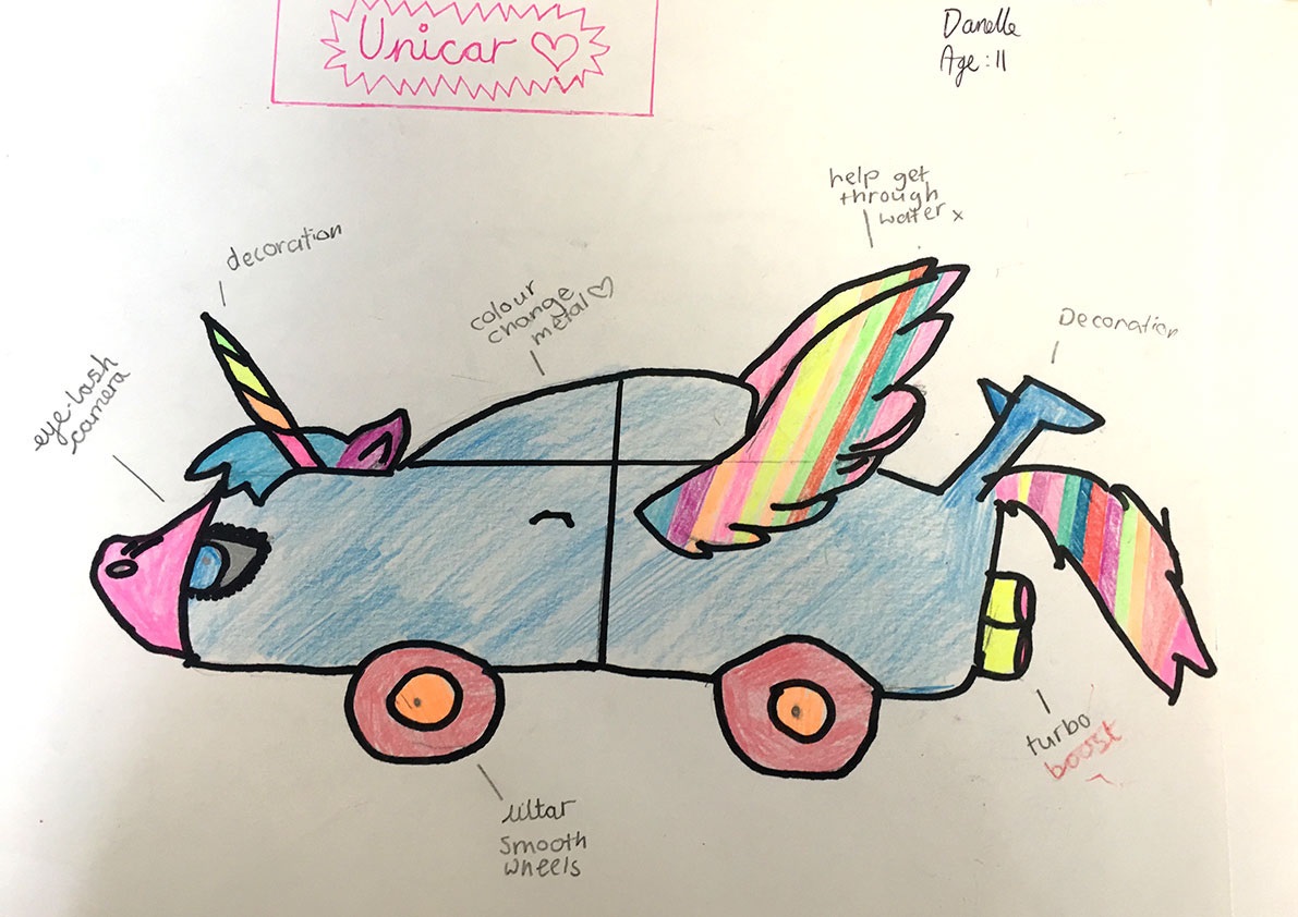 Then there’s Danielle’s Unicar with ultra-smooth wheels made out of metal that can change color. It’s also got multi-colored wings that help the car function underwater. At the front, the headlights are fitted with eyelash cameras. It’s basically Mustang with a unicorn horn on the hood.