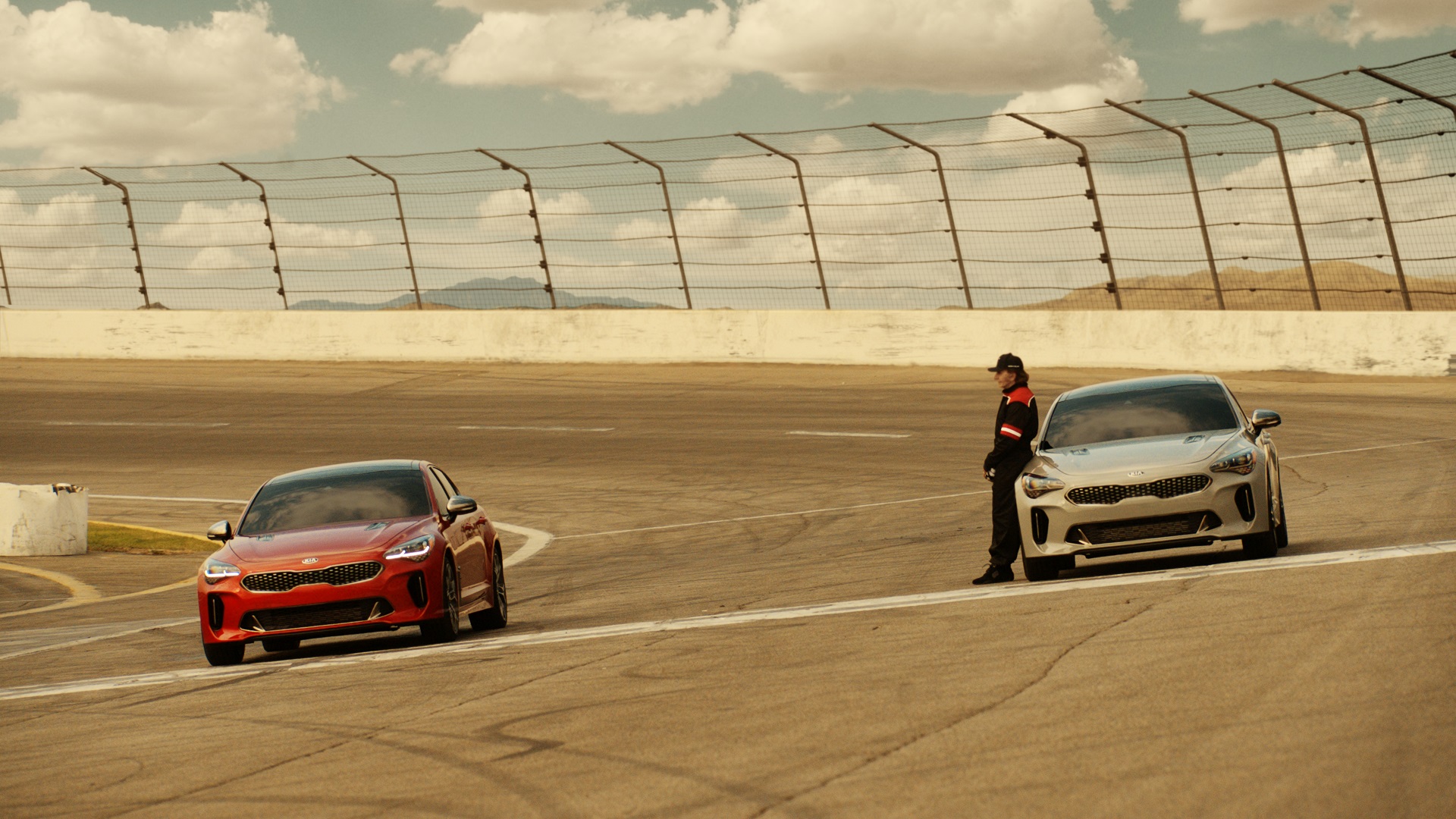 The ad features two Kia Stingers on an abandoned racetrack driven by two racing legends that Kia calls, “Eternally youthful.” One of them is two-time Formula One and Indianapolis 500 champion Emerson Fittipaldi. The other one remains a mystery. After an opening featuring the sun rising above bleachers, with garbage blowing into the stands, the screen goes dark. It then reveals someone with a chrome polished fingernail and large ring pushing the Start/Stop button, firing up the Stinger GT. The scene then fades to black once again, and the camera reveals the two Kias on the race track, with the legend, Fittipaldi standing with his back to one car while giving an approving nod to the other.