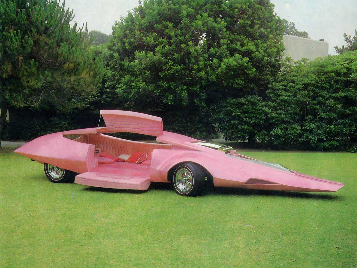This limousine looks like the bastard love child of an aardvark and Steve Tyler’s tongue. Ohrberg built it as a promotional vehicle for The Pink Panther Show, which in the Sixties and Seventies was one of television’s most popular cartoons. “They came to me and asked me to do it,” says Ohrberg, “so I went to Oldsmobile and they gave me two chassis and two motors.” After some marathon sessions with artists Ed “Newt” Newton, Ohrberg built the body out of sheet metal. “We would drive it up in front of Mann’s Chinese Theatre on Hollywood Boulevard, open the doors and a Pink Panther would walk out,” says Ohrberg. “He would go into the theater, watch the cartoon, then come out and drive away.”