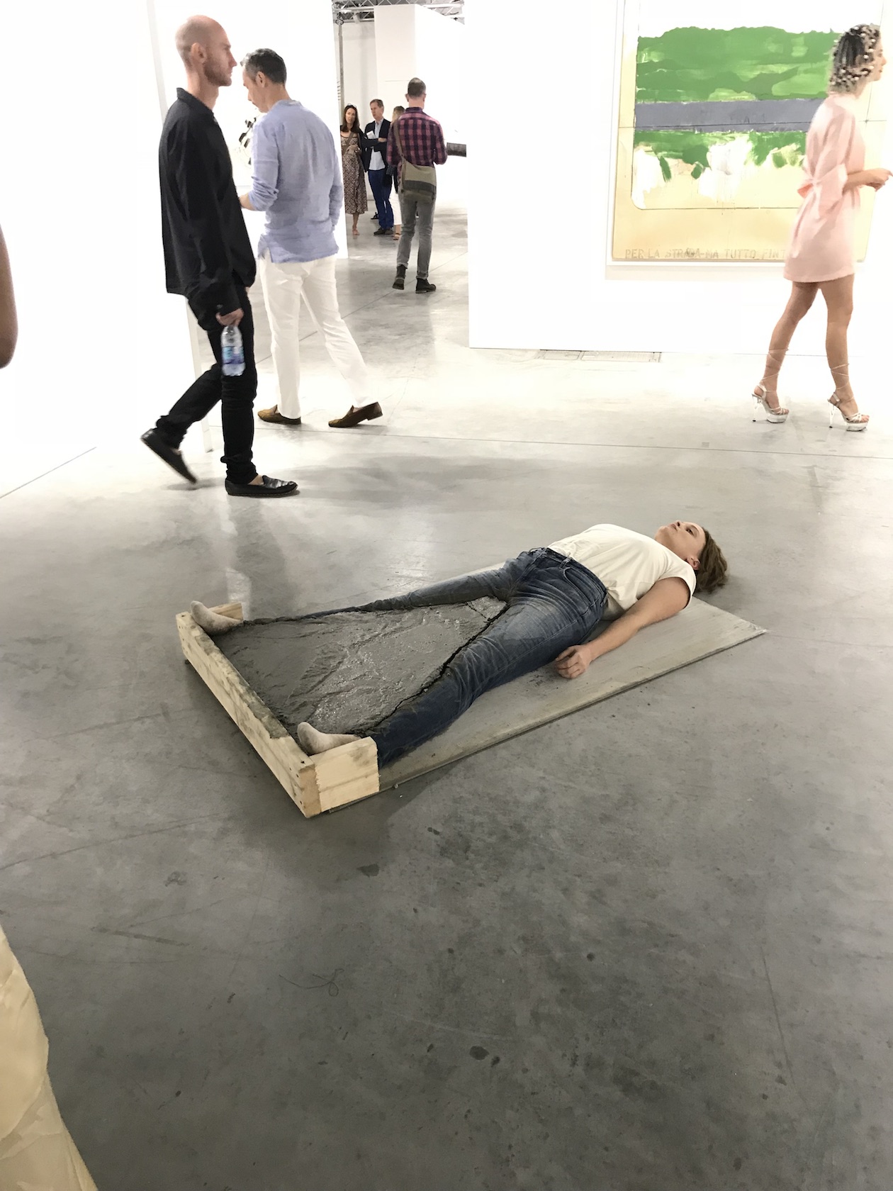 But Miami itself is permeated with art during Basel. It is impossible not to wander into a pop-up show, or come across an installation tucked into the corner of a restaurant or book party, or notice, from a block away, Damien Hirst’s gilded mammoth carcass sculpture “Gone But Not Forgotten” standing sentry at the Hotel Faena. There is so much art during Basel that an unfocused visitor will either become blind to it without the framing effect of a museum or a gallery, or mistake for art anything that exists within a properly suggestive context. It’s an almost perfect Duchampian meta-commentary on modern art, fueled by party drugs and set to an EDM soundtrack.