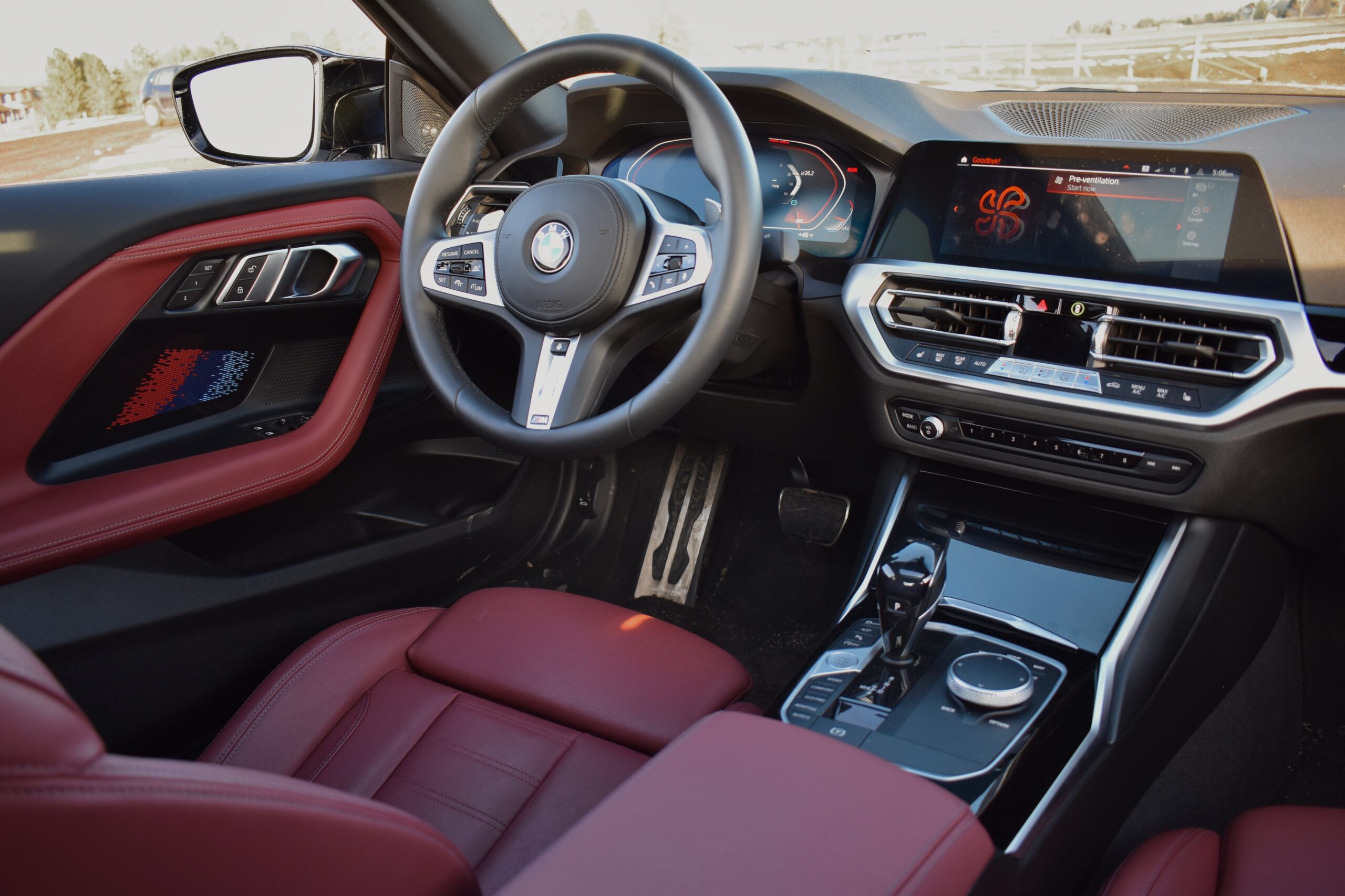 The 2 Series as a whole isn’t poorly equipped and doesn’t go overboard with options, either. A standard power moonroof opens on an ambient-lit interior with two-zone climate, power front seats (with driver-side memory) upholstered in synthetic leather, and a real leather steering wheel. Dual USB ports charge devices capable of linking to the onboard 4G LTE wifi hotspot and the Bluetooth-equipped infotainment, with its 8.8-inch screen, Apple CarPlay and Android Auto compatibility, and 10-speaker audio system. Chassis-wise, all its mirrors dim automatically, there’s connected vehicle tech, and a suite of advanced driving assists: dynamic cruise control, frontal collision warning, lane departure warning, blind-spot detection, and speed limit tracking. A limited warranty covers some of it for four years or 50,000 miles.