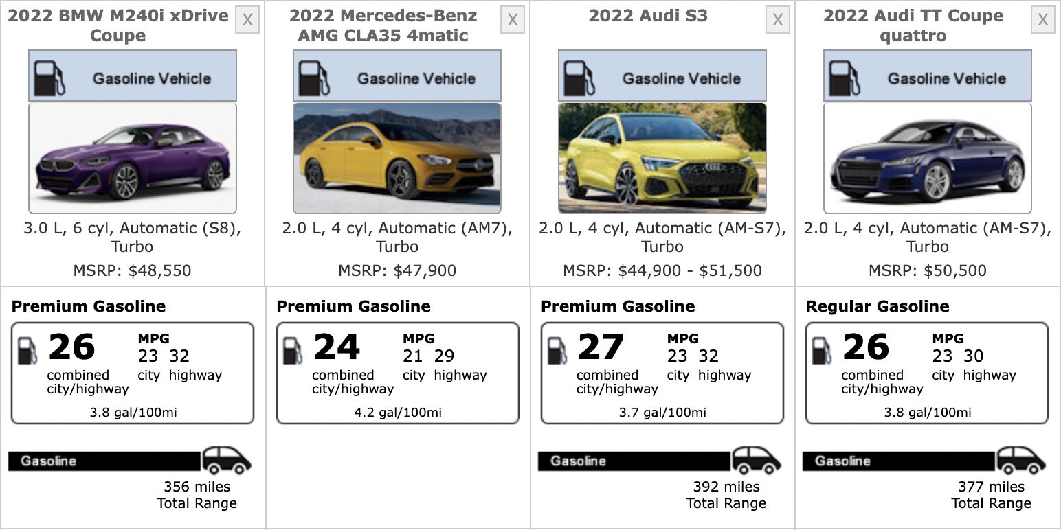 At the price tested, the M240i could be in contention with a huge variety of performance cars, though for the sake of comparison, I’ll keep it to AWD models of similar size and nationality. That cuts it down to the Mercedes-AMG CLA 35, Audi S3, and Audi TT (though to a lesser degree, as it’s way down on power). Both the four-doors don’t offer nearly as much performance, being powered by turbo four-cylinders, which also don’t make as nice a noise—though the Audi has better gas mileage and a famously tunable engine that can make up the gap.