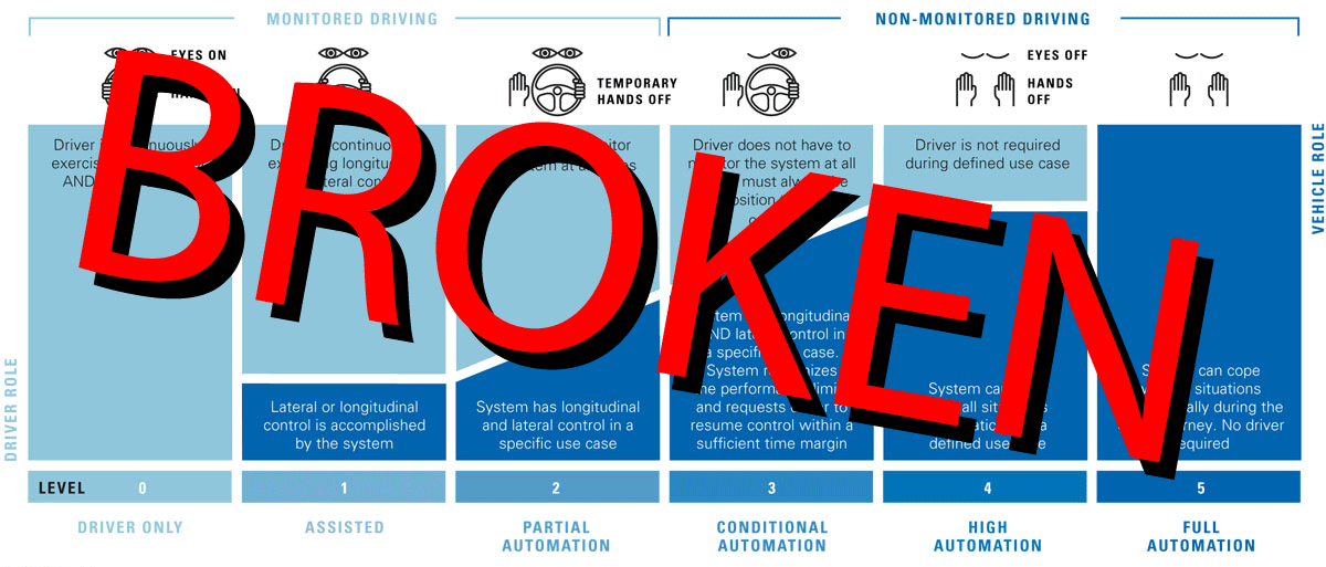 There is only one solution, and that’s to toss the SAE language and start from scratch. The bar for use of the words “autonomous” and “self-driving” needs to be set so high that no media outlet can exploit them for traffic, no car company car use them in a press release to boost their stock price, and most importantly, no driver thinks they can take their hands off the wheel, even temporarily.