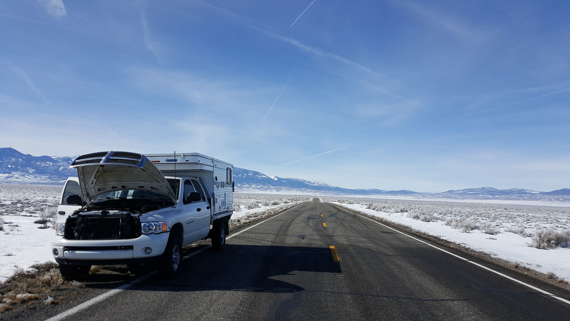 The sun shone on the cold desert, the sky drowning blue and cirrus fractured, clouds floating 18,000 feet over the calamity unfolding beneath my boots. The windshield was full of the painted desert, white with snow from a week-gone winter storm. The voltmeter on the Dodge’s dash floated at an uncomfortable 12.5 volts, two below normal. The alternator wasn’t charging. Ninety miles outside Delta, Utah, I sat inside the truck, shouldered on the side of Highway 50. The two-lane vanished to perfect pinpoints on the frozen basin, east ahead and west, behind. I took a breath. Ran my hands over my face. I hadn’t yet had the camper for two full days.