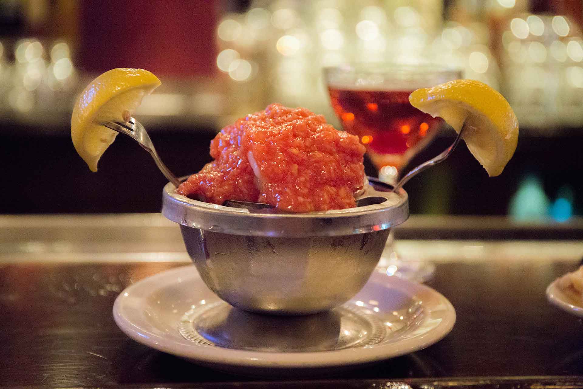 There’s a delay between biting in and when it hits you. Then your eyes start watering. Then, panic, for a split-second. Oh my god, you think. This is how it ends. Then you breathe in. Breathe out. Then you immediately want more. More perfect sauce, more juicy chilled shrimp. And then you look over, guiltily, at your west coast editor, because you’ve just wolfed down an entire jumbo shrimp cocktail before he’s taken a stab.