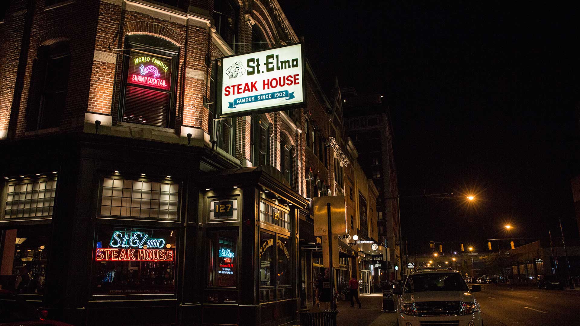 St. Elmo Steak House has been here, in Indianapolis, since 1902. During that time, there’s been only three proprietors: Joe Stahr, the founder; Izzy Rosen and Harry Roth, lifelong friends who took over in the Forties; and its current owners, the Hughes family. It’s a warm place, wood inside brick, homey in the way all traditional American steakhouses are. St. Elmo is nationally recognized, but it isn’t a tourist trap. There are no novelty t-shirts or souvenir coffee mugs. The wait staff wears bowties.