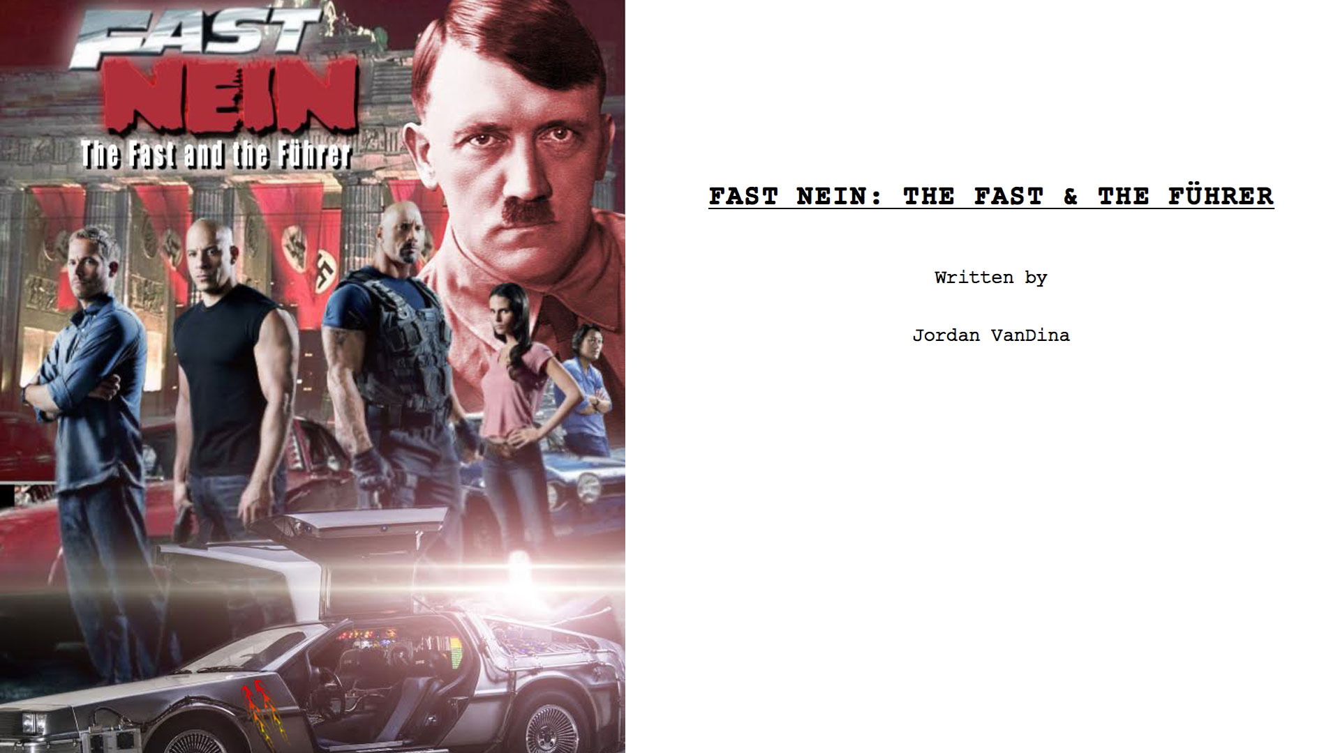 Fast Nein: The Fast & The Führer solves that problem. The script is the masterwork of Jordan Vandina, a screenwriter whose satirical eye is belied by the pun-y title. I urge you to read the script for yourself. Because it’s a certain type of genius.