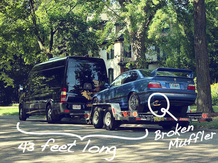 The next morning was better. I picked up my friend Tim Cowhey, who volunteered to copilot for the trek East. The worst part of any move, he agreed, is dealing with the garage. Spare parts and tools are cargo; the unending procession of wheeled crap behind is an albatross. Here, the latter was an old BMW M3 track car, too long to be trailered with the bumper on and, as we learned, too low to be loaded without mangling an exhaust hanger. Muffler askew, our Teutonic centipede wriggled out of Michigan.