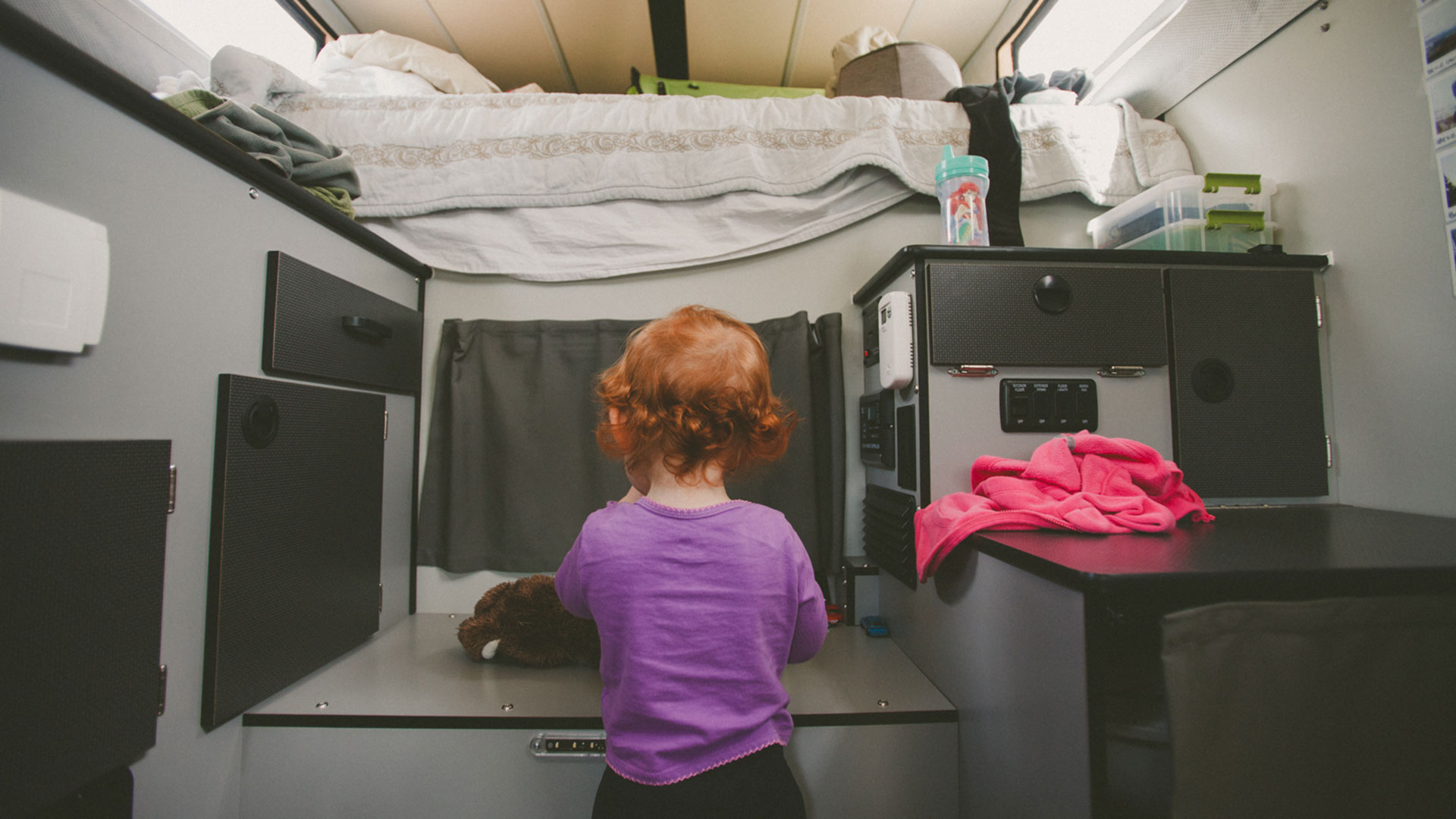 And that’s what’s in my mind as I watch everyone drive off into the morning fog. As my daughter shuffles a few steps to the camper door, pulls back the curtain and cries, “momma!” again and again, her breath on the glass and her brown eyes wild with worry. She points to the photos of my smiling wife on the wall, desperate to communicate what we’ve both lost for the day.