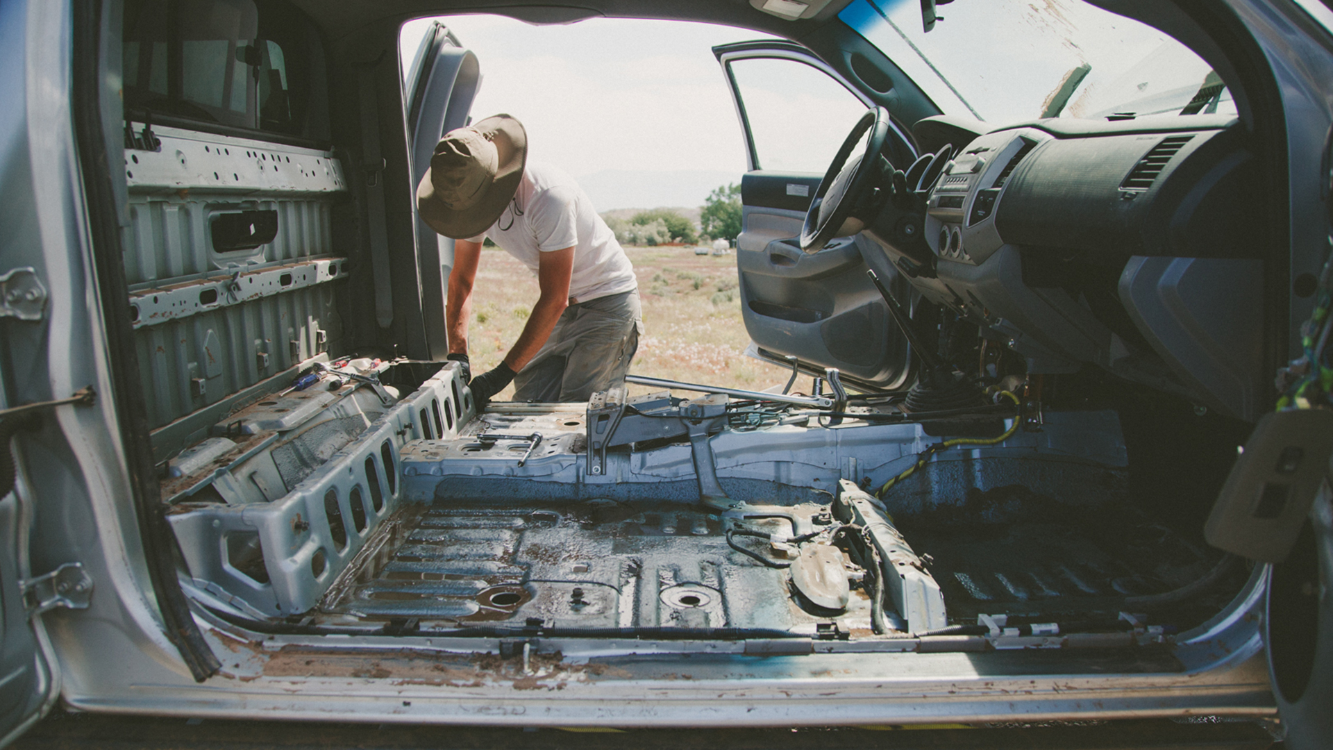 We pulled Kevan’s Tacoma to Grand Junction and spent a day dissecting the interior. Letting the arid desert sop up the river water left in the cab. If the soaked seats and carpet were bad, the astonishing amount of sand stuffed everywhere was worse. The current had carried silt to every crevice, filled every cavity with heavy red grit. The passenger door was so full we couldn’t get it open at first. The hood had doubled in weight, its substructure now lined with 100 pounds of the stuff.