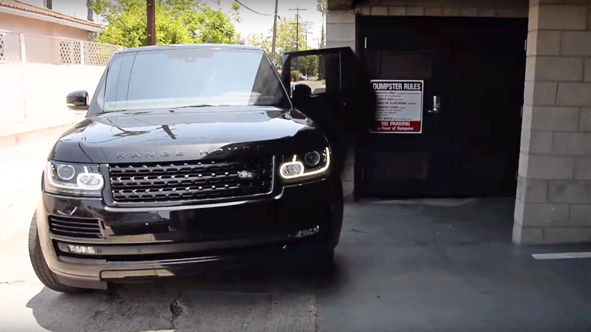 Harris hops into his Range Rover and starts to back up to escape the recording lensman . . . except he left his back door of the Rover open and, in cringe-inducing slow motion, we see it connect with the brick facade of the building and bend in the wrong direction.