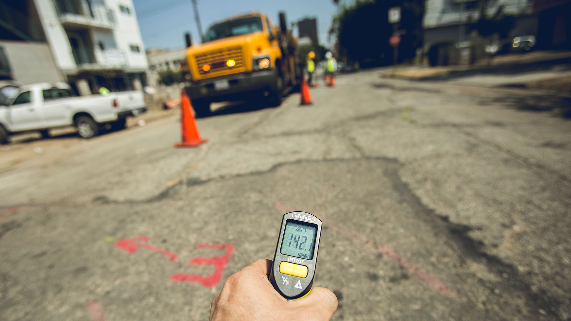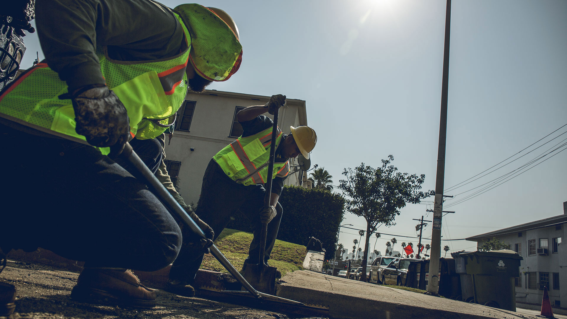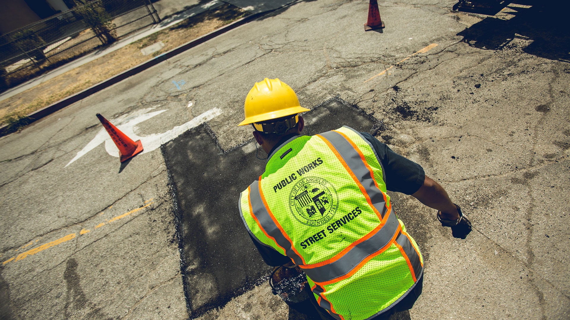 By 9:30 in the morning, the Koreatown pavement has hit 106 degrees. It’s all alligator cracks. Shear lines and potholes—big ones, by LA standards. And by 11:00 am, two fit young men with strong forearms and deeply tanned faces will have fixed all those potholes. They’ll have descended upon it from a big city truck in safety yellow and hard hats, coned off their turf, and used specialized tools to shovel asphalt, rake it out, beat it flat, and seal it against wet weather on a summer day when rain seems impossible. They’ll repeat the process over and over, and when they finish, a road that needs replacement will have had its life extended. It will be safer for cars and bikes and pedestrians alike. And then they’ll break for lunch as the pavement tops 142 degrees before starting all over again, on another beat-to-hell patch of Los Angeles road.