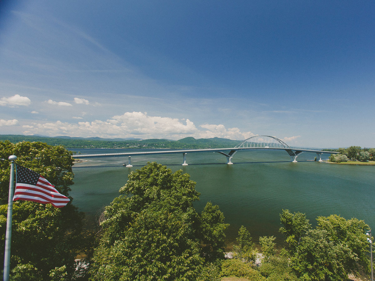 We’ve covered enough miles to know where we are, that we’ve wandered into the estuary that happens along state lines. That we’re in the muddled country where New York fades into Vermont. We know it long before we see the Champlain Bridge for the first time, sweeping over a narrow gap in the land, reaching above a smattering of sailboats tilted with the gentle hand of the wind.