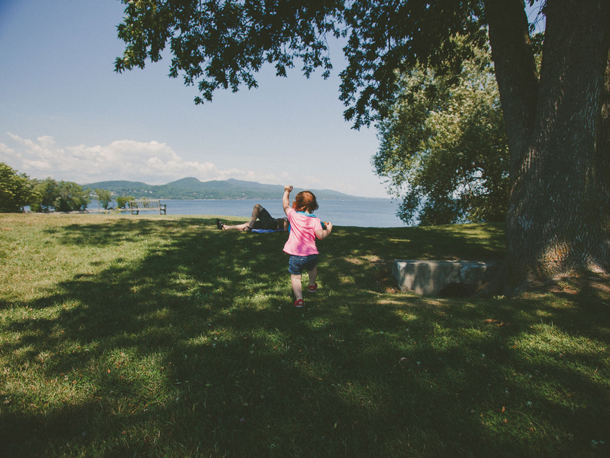 We pull into the Crown Point Historic Area, make sandwiches, and spread a blanket beneath a maple tree. We eat lunch there in the shadow of old bulwarks, the manmade hills soft with swaying grass, the remains of two stone forts quiet in the heat of the afternoon. Lake Champlain spreads out beneath us, a sheet of its own, and the water breathes a cool breeze up to us. Kiddo laughs and toddles around, orbiting her mother and I, stopping back in for bites of peanut butter and jelly sandwich, fistfuls of graham crackers.