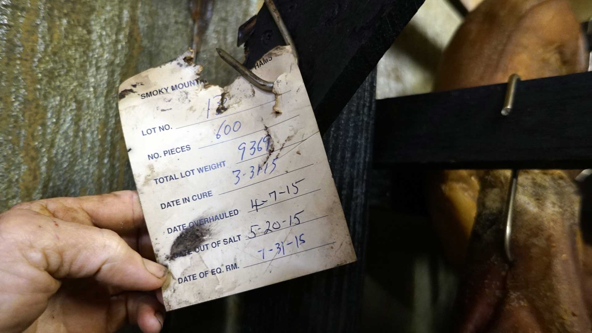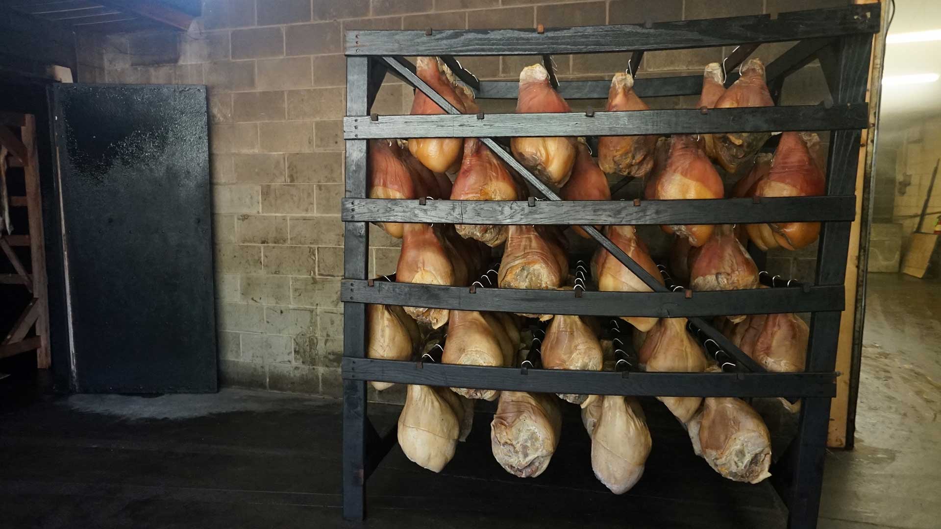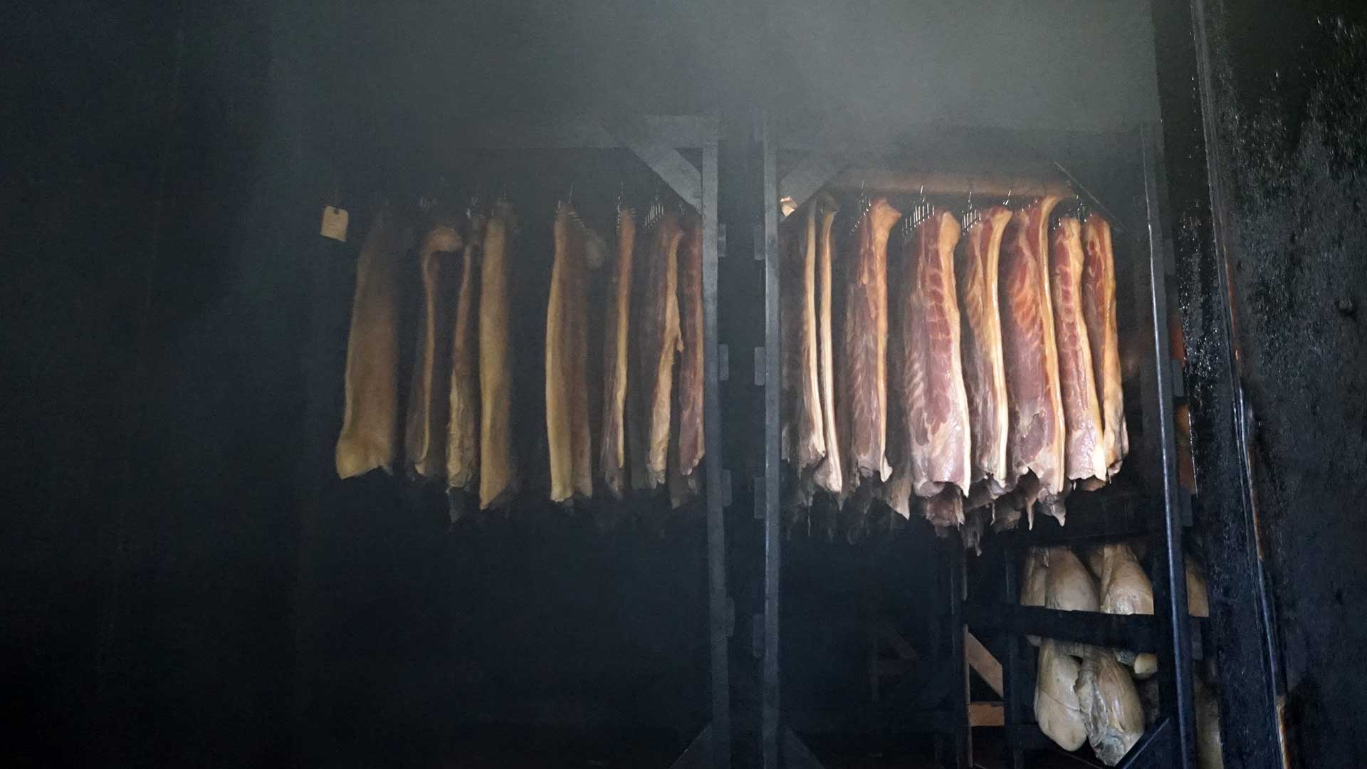In the back, the smell in the air is not subtle. Hickory smoke hangs on everything, and something like 2,000 cured hams and bacon slabs dangle from hooks and in large, wheeled wooden frames. Benton’s is a family shop that’s stood along Tennessee highway for a few decades. The smokehouse is out back, and Dave feeds chopped hickory into a furnace. Sometimes, when there’s a special order, he’ll pick from the stack of apple wood nearby. “Only for special orders,” he says.