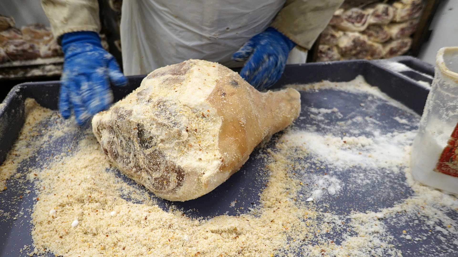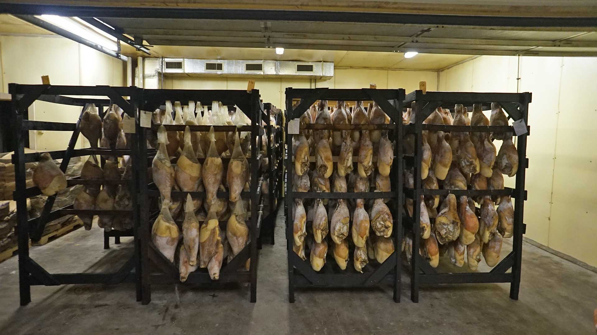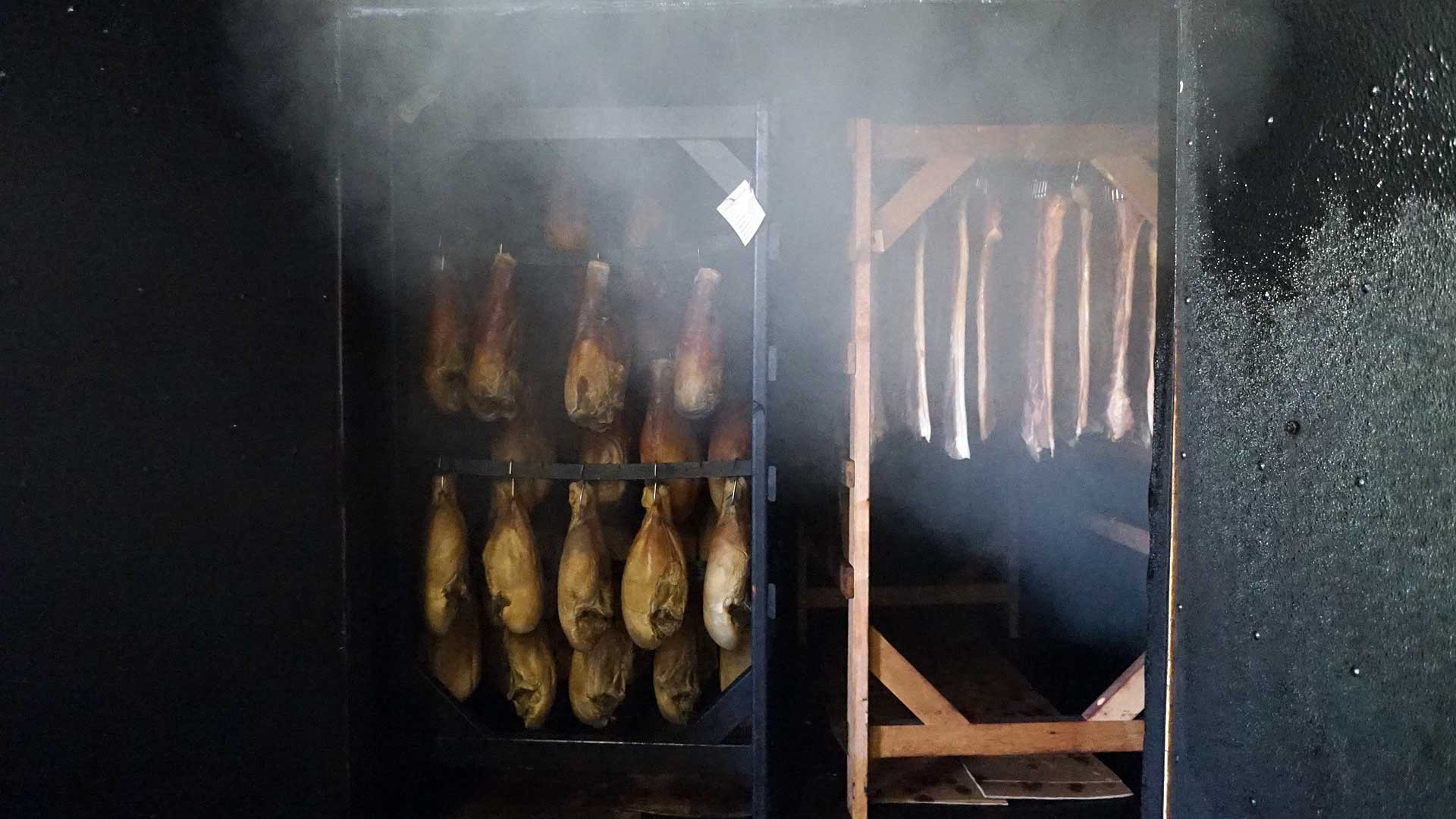 In the back, the smell in the air is not subtle. Hickory smoke hangs on everything, and something like 2,000 cured hams and bacon slabs dangle from hooks and in large, wheeled wooden frames. Benton’s is a family shop that’s stood along Tennessee highway for a few decades. The smokehouse is out back, and Dave feeds chopped hickory into a furnace. Sometimes, when there’s a special order, he’ll pick from the stack of apple wood nearby. “Only for special orders,” he says.